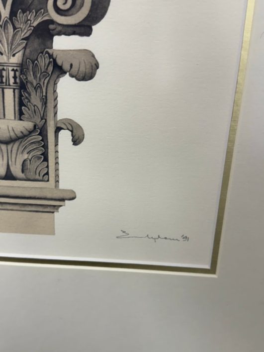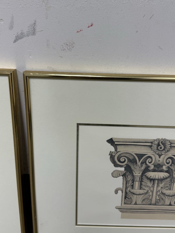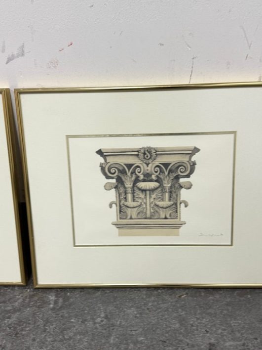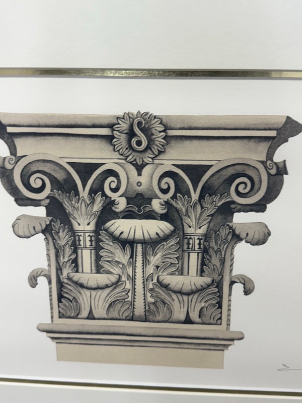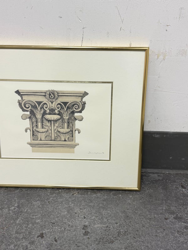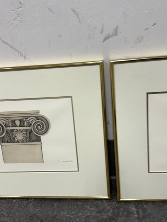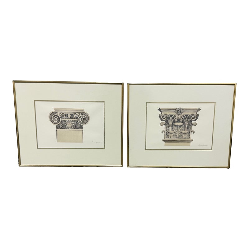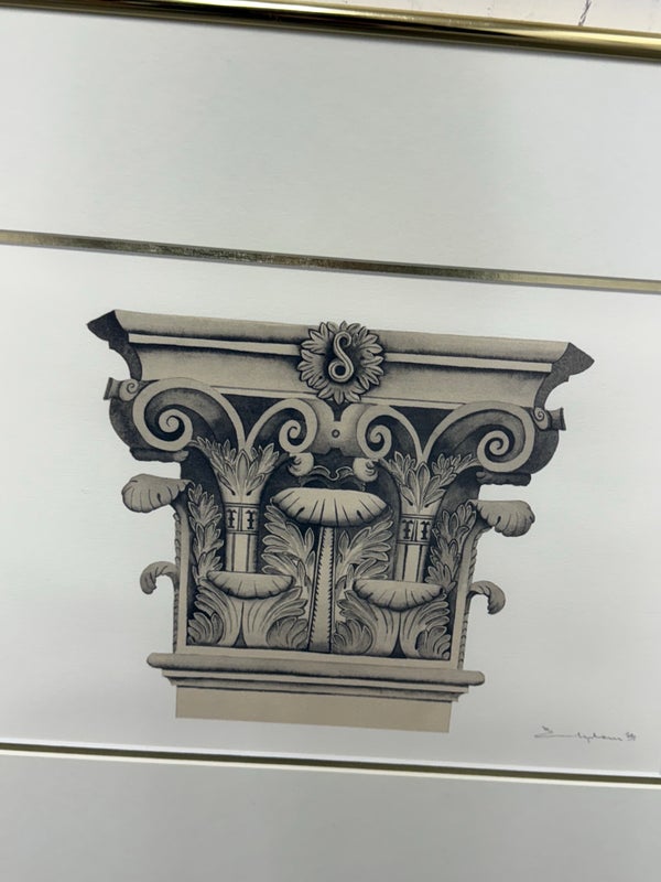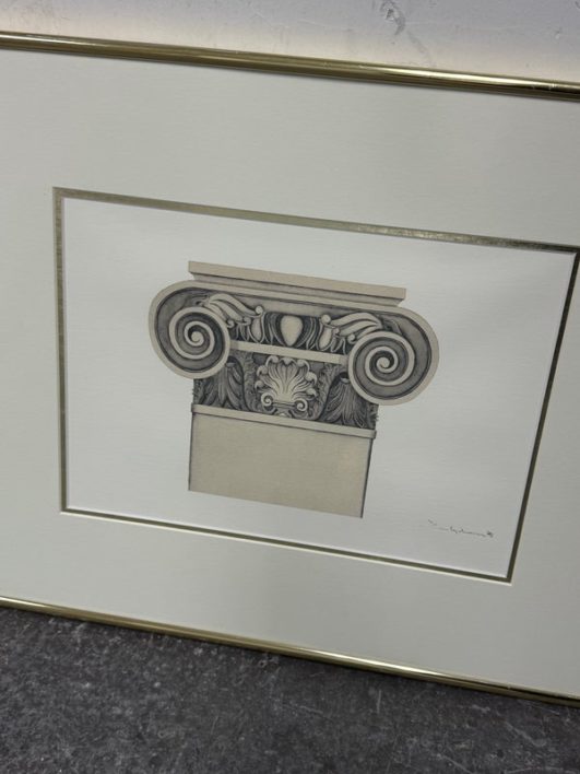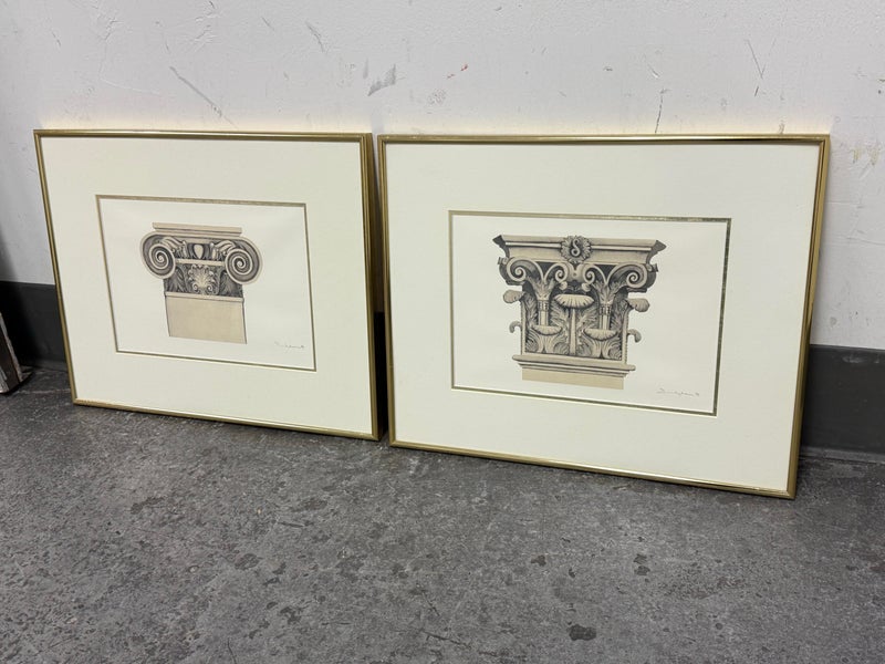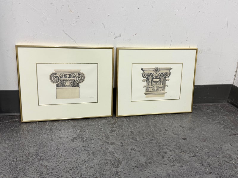 Design Plus Gallery presents a Set of Two Architecture Prints by Evelyn Lam. Nicely framed and signed on both, you get to see the detail that went into greek columns. Both are in good condition with minimal signs of wear for their usage.