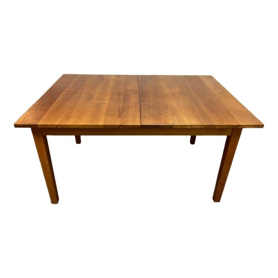 Design Plus Gallery presents a Cherry Dining Table + 3 Leaves by Evolution Home Furnishings. Constructed with cherry wood. The table has four square legs. The table opens to show three stored leaves that extends by 35.25 inches. Minor wear from use; table is in good condition.
