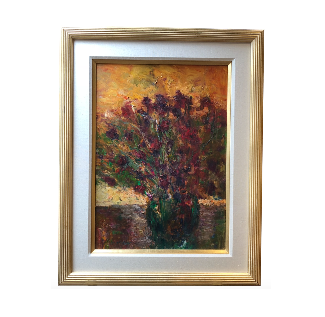 Design Plus Gallery presents an original oil by Dan McCaw. A moving still life with flowers. An artist that has been referred to as one of America’s most highly respected contemporary impressionists, he is well known for his serene scenes depicted in soft tones and colors. A solid foundation of design, color and value distinguishes McCaw’s expressive paintings and provide an exploration of new ways to look at familiar objects. A skilled and discerning interpreter of color harmonies, light and mood.