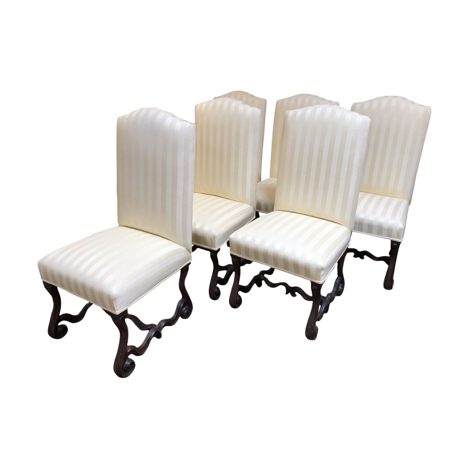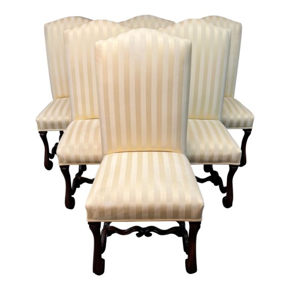 Design Plus Gallery presents the Ivory + Gold Damask Stripe Dining Chairs, Set of Six. The chairs are upholstered in a Gold and Ivory stripe fabric. Welting is present on the seats’ aprons and backs’ perimeters. The frames are constructed with wood in a deep, rich tobacco color. The legs are curved, feature rolled accents on the bottom, and are stabilized with I-shaped beams. Minor wear from use, including some stains on the fabric (see photos); chairs are in good condition.
