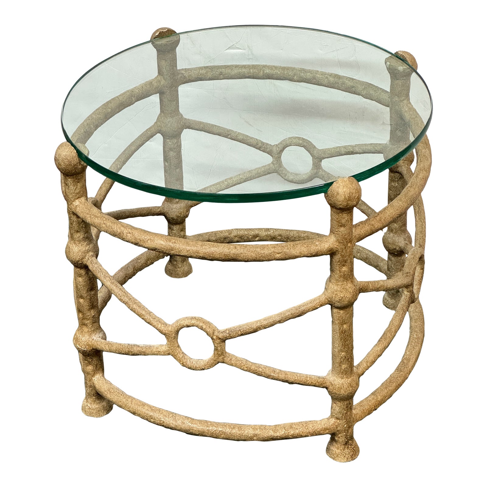 Design Plus Gallery presents a Faux Bamboo Accent Table. Light and airy in appearance, this unique table is cast in metal in a classic “target” pattern and powder coated. Topped with a clear round of glass, the table is useful in many spaces for many uses. Light surface wear, condition is consistent with age and use.