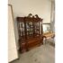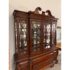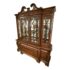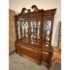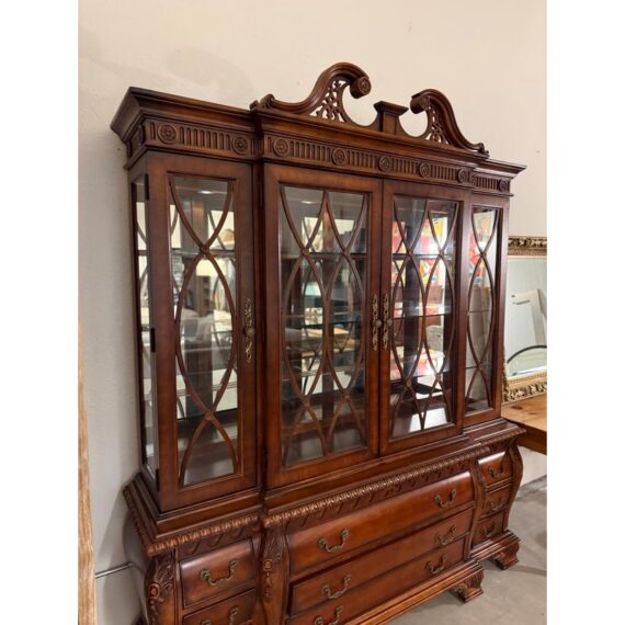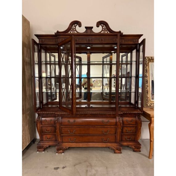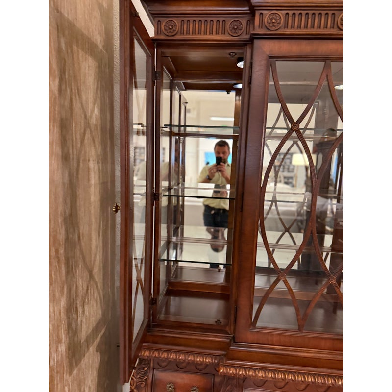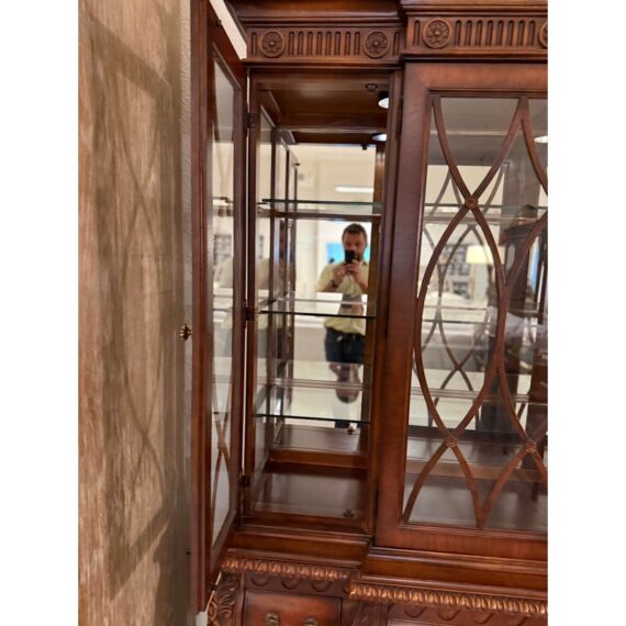 Design Plus Gallery presents a Federal Style Carved Mahogany Lighted Breakfront China Cabinet. Made from solid woods and mahogany veneers, this substantial case is detailed with a carved scroll crest, dentil-style trim, and a breakfront profile. The upper cabinet includes three glass shelves with a mirrored back panel, framed glass doors with arched latticework, and interior lighting to illuminate the display area. The base offers nine drawers in total, including three wide center drawers with velvet-lined interiors, plus flanking drawer stacks with ornate brass pulls and carved corner accents, all raised on carved bracket feet. It is in good condition with visible and minimal wear from usage.