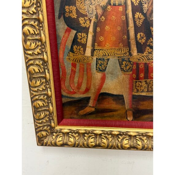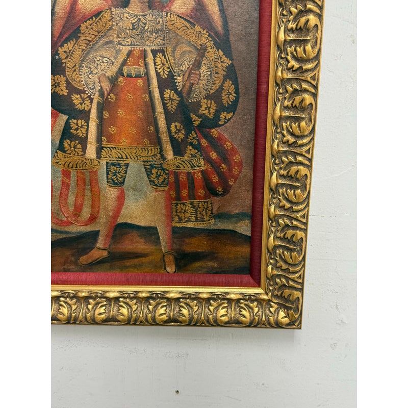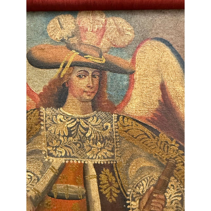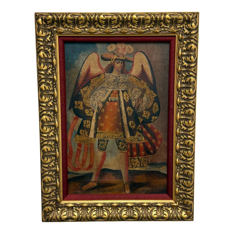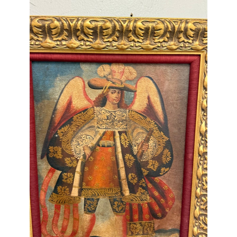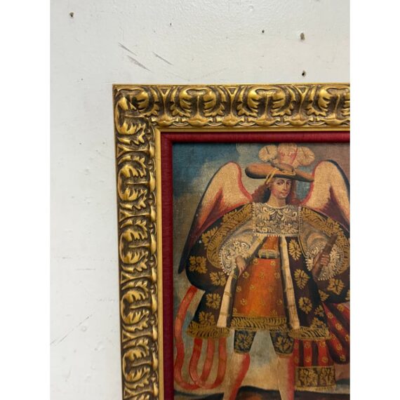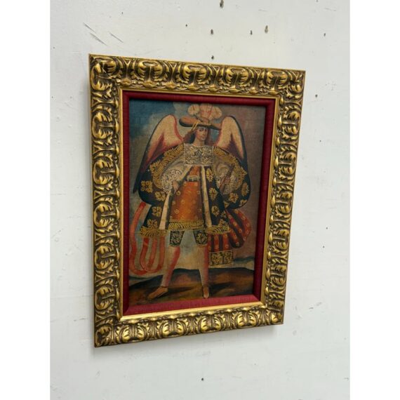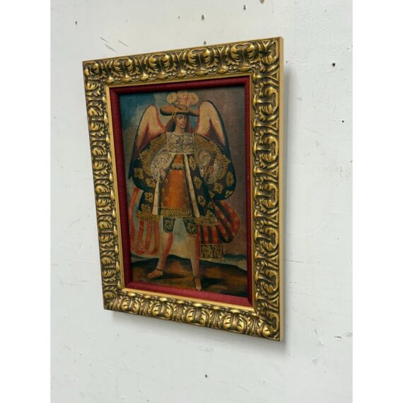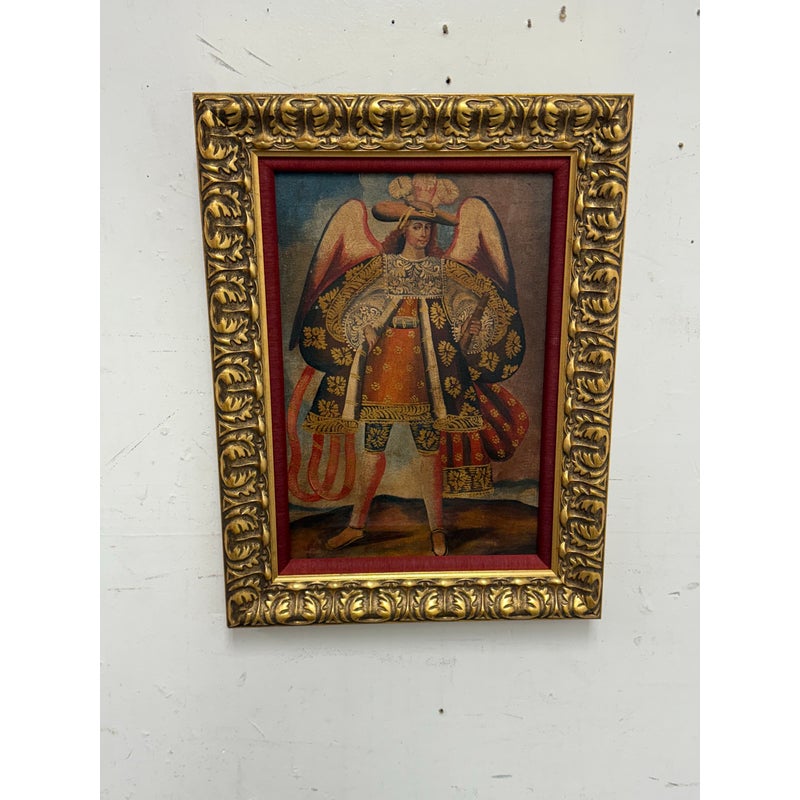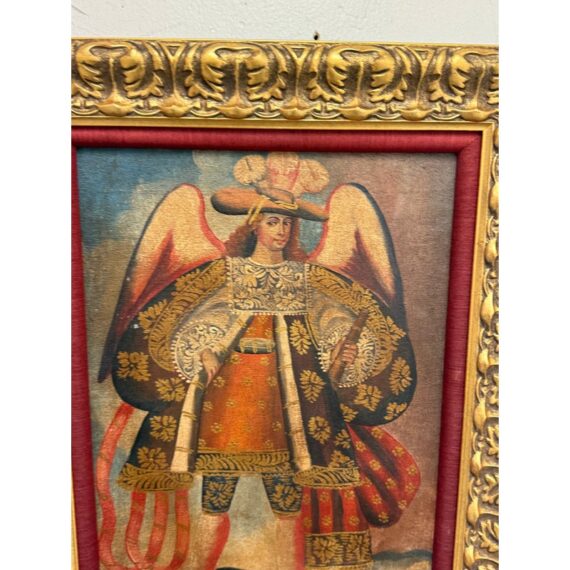 Design Plus Gallery presents an Oil Painted of Archangel Uriel from the Cuzco School of Painting. This dramatic portrayal of the Archangel Uriel is a fine example of the tradition of “Archangel Arcabuceros”. Uriel is known as the angel of wisdom. He shines the light of God’s truth into the darkness of confusion. Uriel means “God is my light” or “fire of God.” Other spellings of his name include Usiel, Uzziel, Oriel, Auriel, Suriel, Urian and Uryan. He faithful turn to Uriel for help seeking God’s will before making decisions, learning new information, solving problems, and resolving conflicts. They also turn to him for help letting go of destructive emotions such as anxiety and anger, which can prevent believers from discerning wisdom or recognizing dangerous situations. The art piece is elaborately framed in an extraordinary golden frame custom from Michael’s. Overall the art piece is in good condition for its usage.
