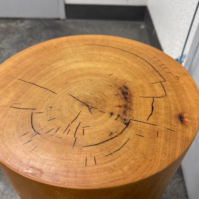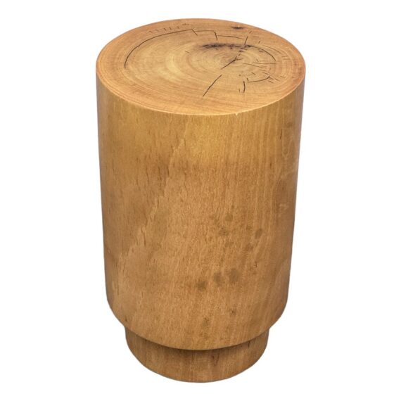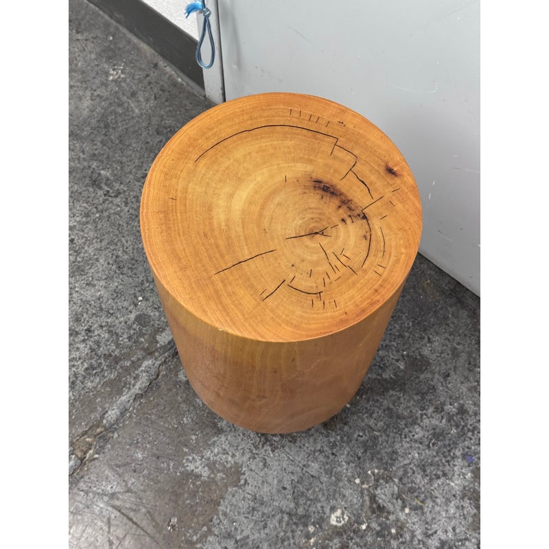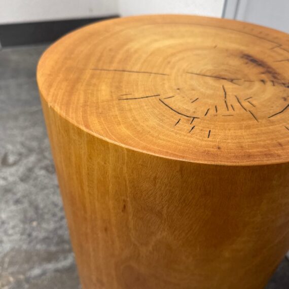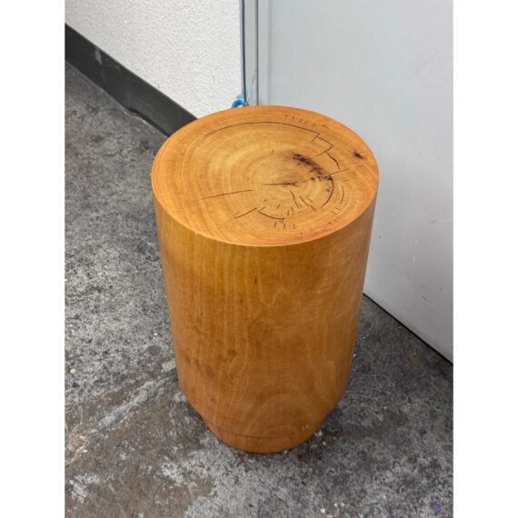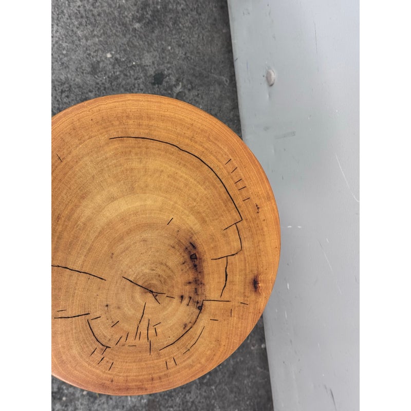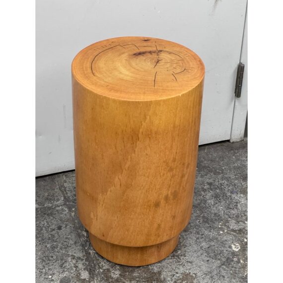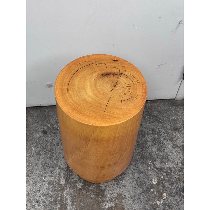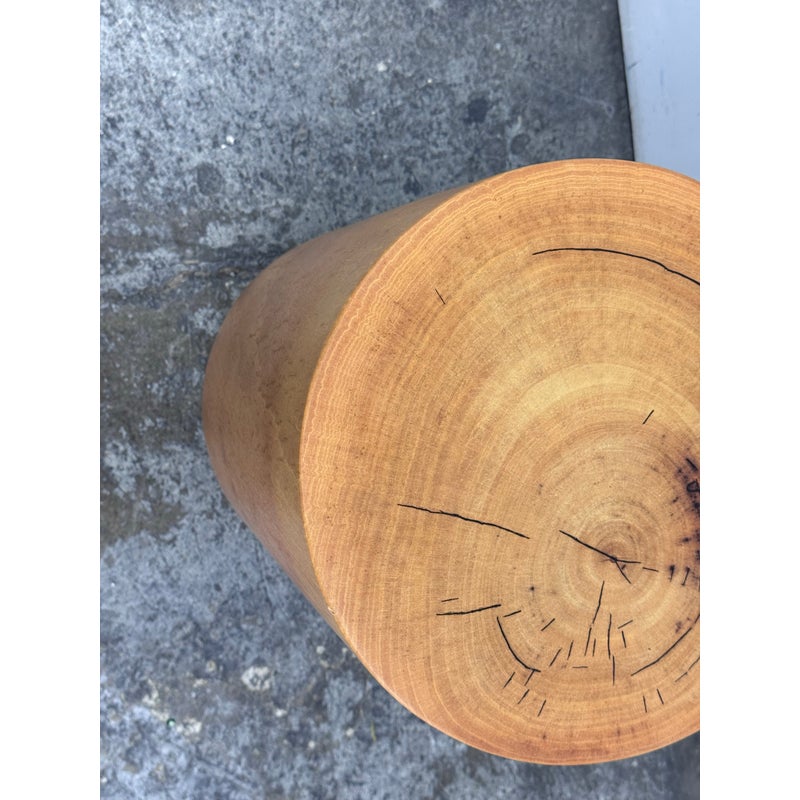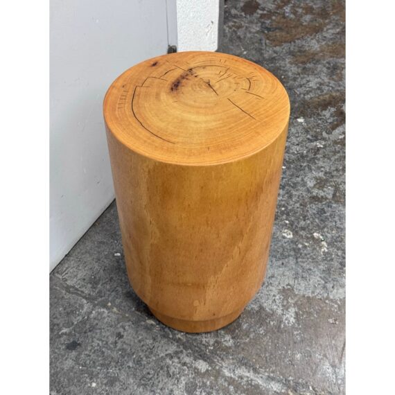 Design Plus Gallery presents a Nicely Finished Near Raw Tree Stump Side Table. The perfect rustic companion for your home; this side table will bring the outdoors in. The wood offers a nice honey brown tone with a narrow its rings exposed on the surface and minimal drying to the top with some splits. Overall the side table is in good condition with minimal wear for its usage.
