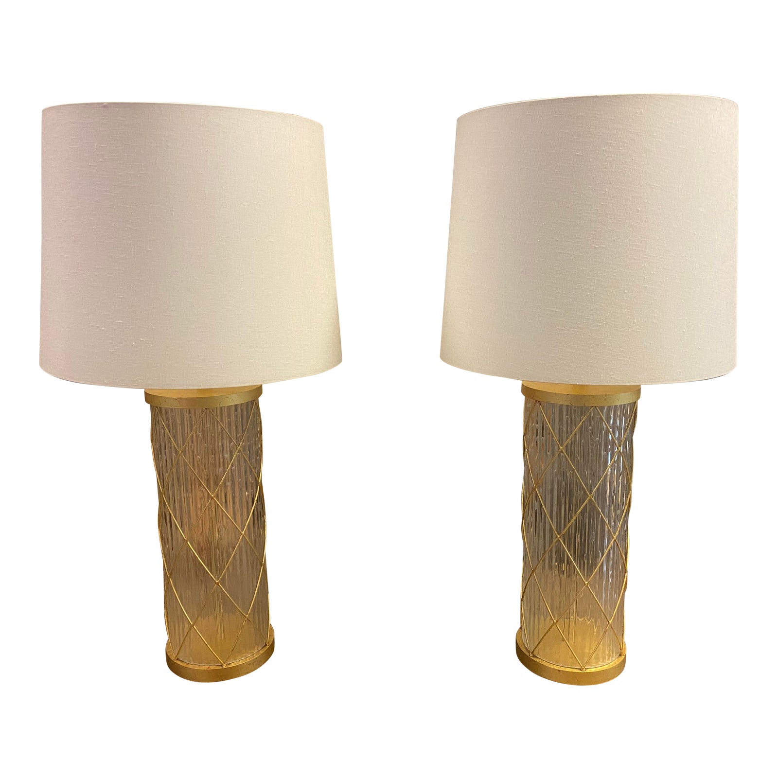 Design Plus Gallery presents a pair of Fisher Weisman Montgolfier Grand Table Lamps. From The Kentfield Collection. Monumental sizes add an anchoring illumination to any space. Caged fluted glass has bubbles seeded through out the vertical expansions in a subtle patterning. Cage is a large diamond pattern with gold leaf application. Large linen shades have frosted acrylic plates on top for softening the light with coordinating finial. Glass pull chains give independent control to dual light bulb sockets. Little evidence of wear. Bottom of lamps are lined with leather.