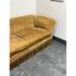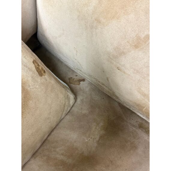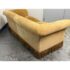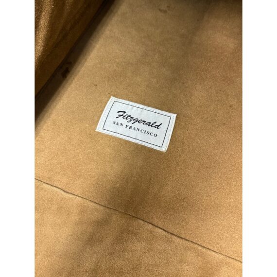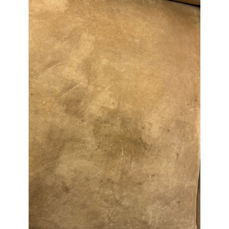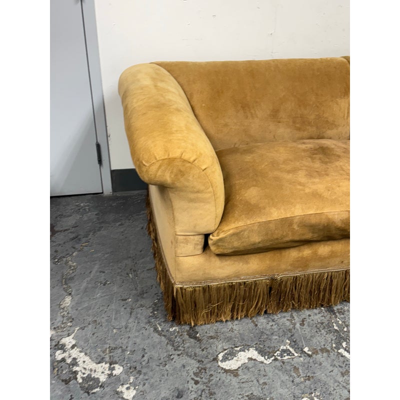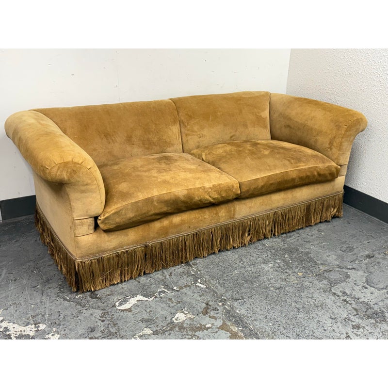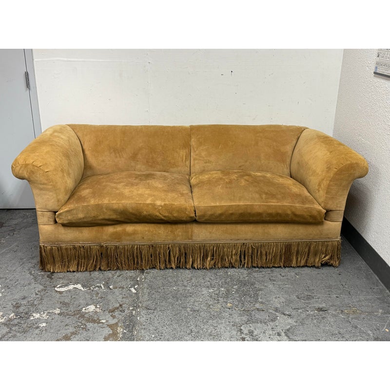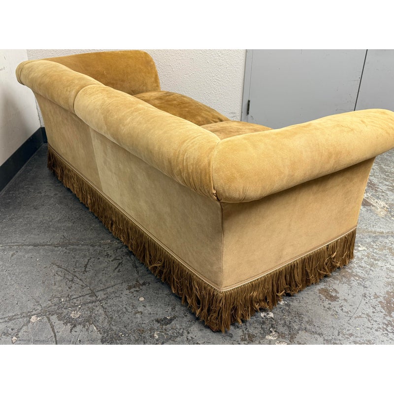 Design Plus Gallery presents a Custom Design Suede Sofa + Fringe by Fitzgerald. This custom sofa exudes traditional charm and inviting comfort. Its design features elegant flared, rolled arms that gently curve outwards. Two loose seat removable cushions. The sofa is upholstered in a caramel suede fabric, a warm tone which enhances the welcoming ambiance of any living space. Along the bottom edge, a custom fringe adds a touch of bespoke sophistication and playful texture, subtly swaying just above the floor. The surface of the suede shows visible and natural wear, lending the piece a well-loved, lived-in character. In good condition, visible discoloration, marking and minimal wear. Would benefit with a professional cleaning. Made in San Francisco, California, USA.