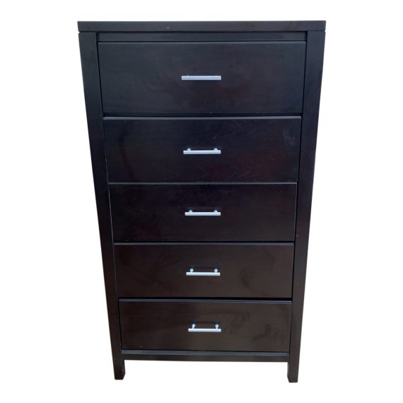 Design Plus Gallery presents a Contemporary Five Drawer Dresser Espresso Finish. Brushed silver hardware pulls anchor each drawer. Some of the drawers need re-working. Wood veneers and laminate made of a deep espresso finish. Contemporary lines and dark finish mixes well with many styles.