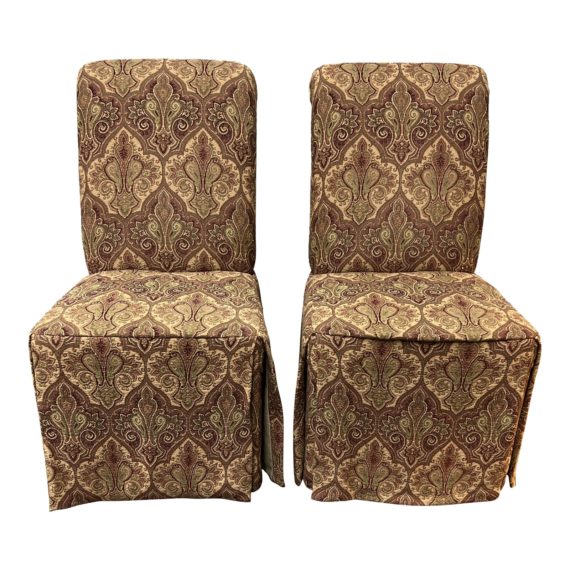 Design Plus Gallery presents a Pair of Fleur De Lis Skirted Chairs on Castors. High and rolled backs offers plenty of support while being open and inviting. A vibrant + contemporary Fleur De Lis pattern blends cream, maroon and green. There is minor wear through out, pair is in good condition. Castor base is disguised behind the skirt.