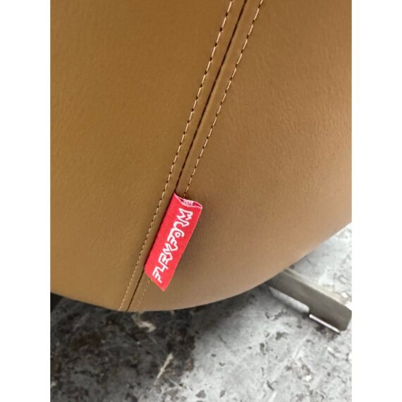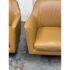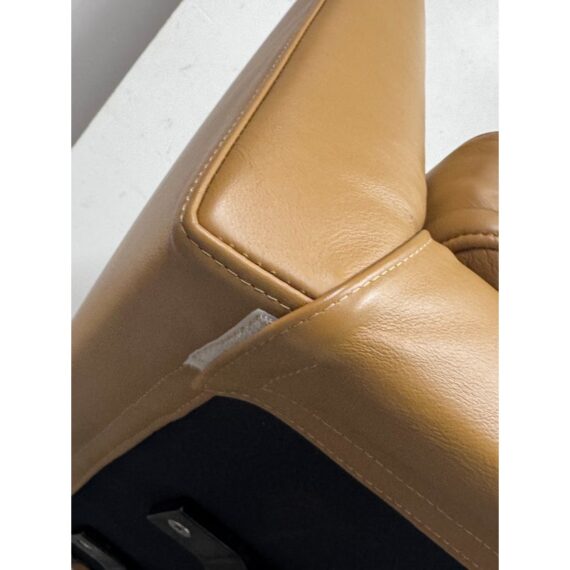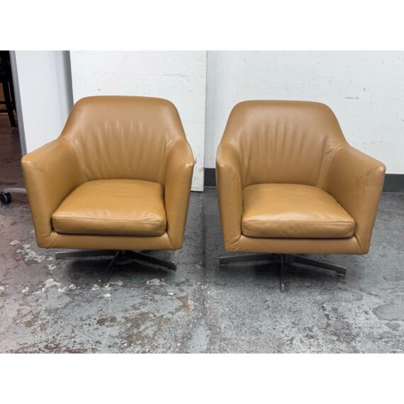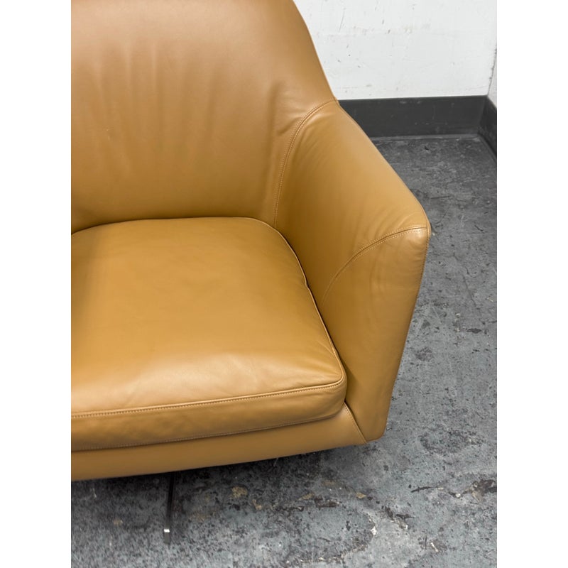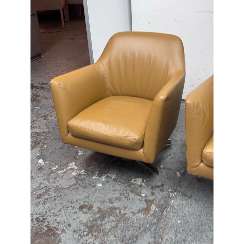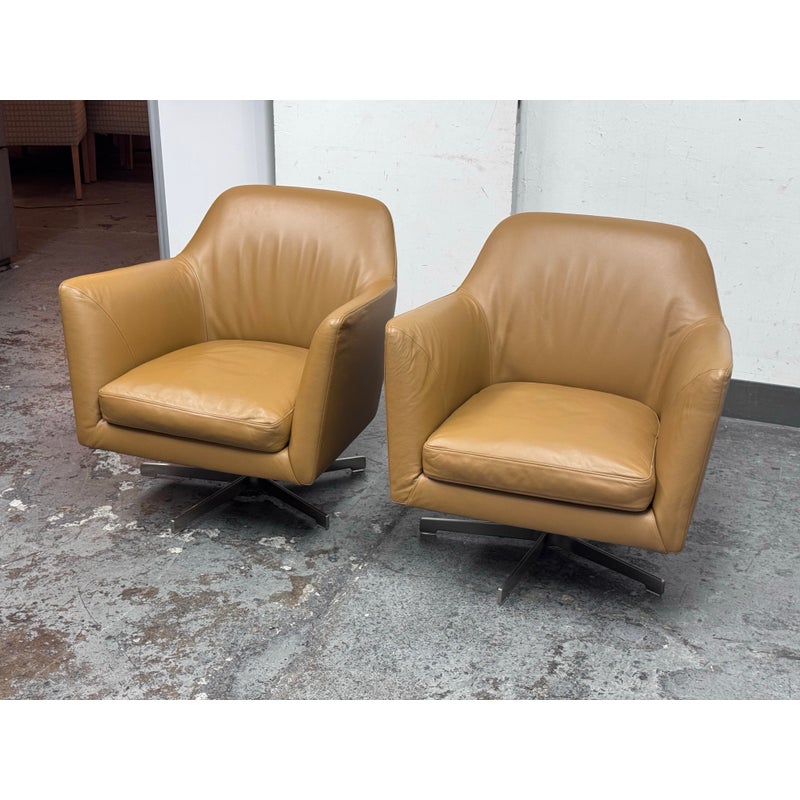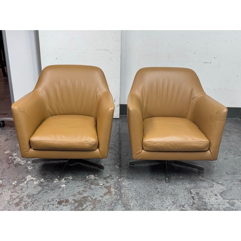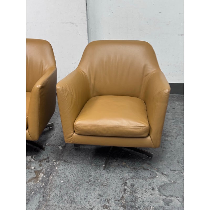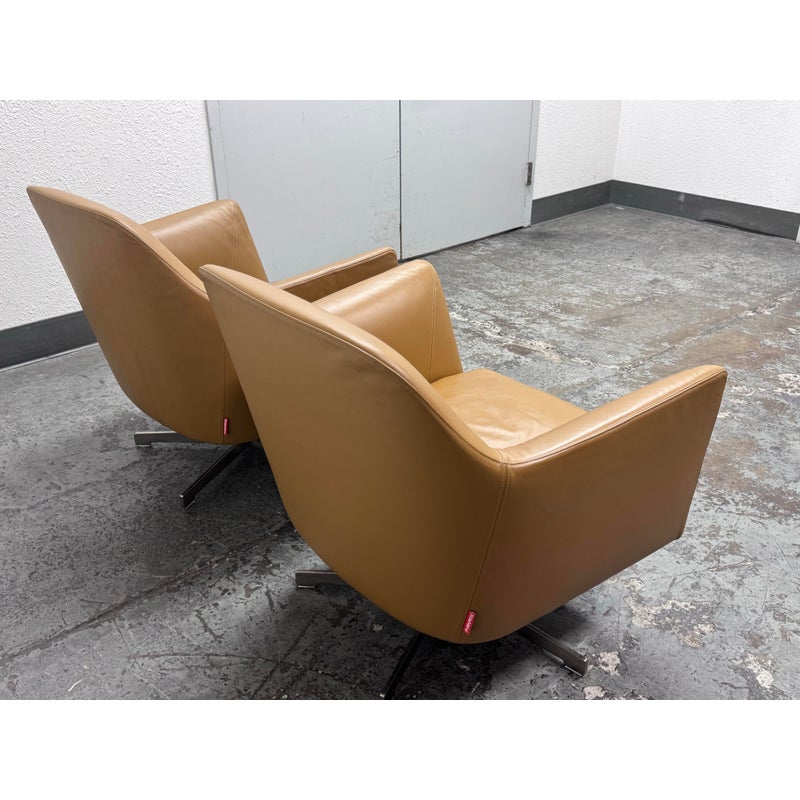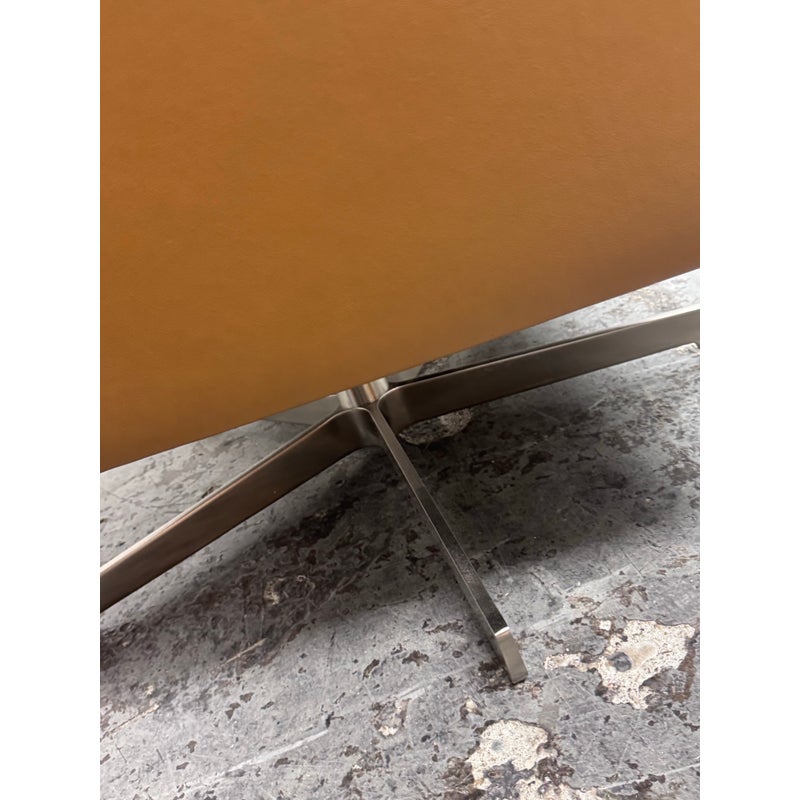 Design Plus Gallery presents a Pair LUCE Arm Chairs from Flexform. The two chairs offer classic lines, tempered with a more uncluttered, contemporary look. The Luce armchairs are custom-designed to set a tone of style and elegance in both residential and hospitality settings. Thanks to its ergonomic shell and the generously-sized goose-down cushions, they are engineered for extreme comfort. They offer comes a five point swivel base of stainless steel and saddle brown leather upholstery to the entire upper part of chair and removable seat cushion. Both are in good condition with minimal surface wear for their usage. Made in Italy.