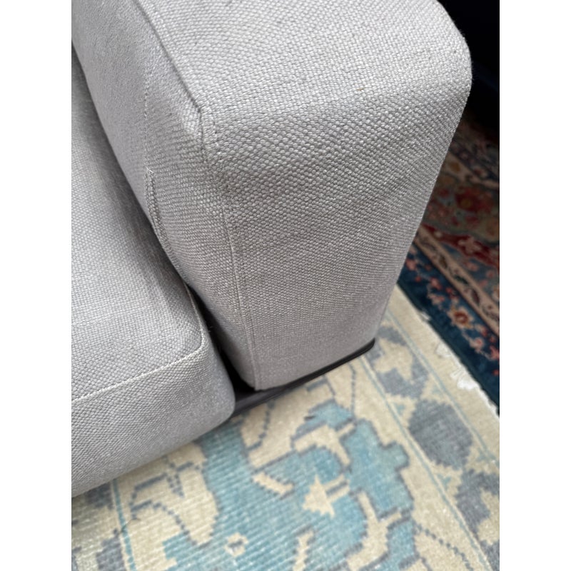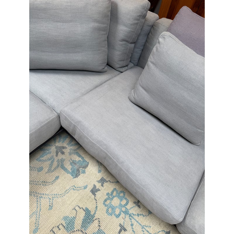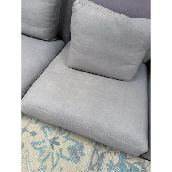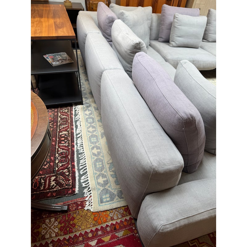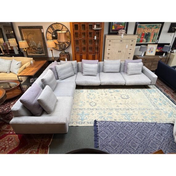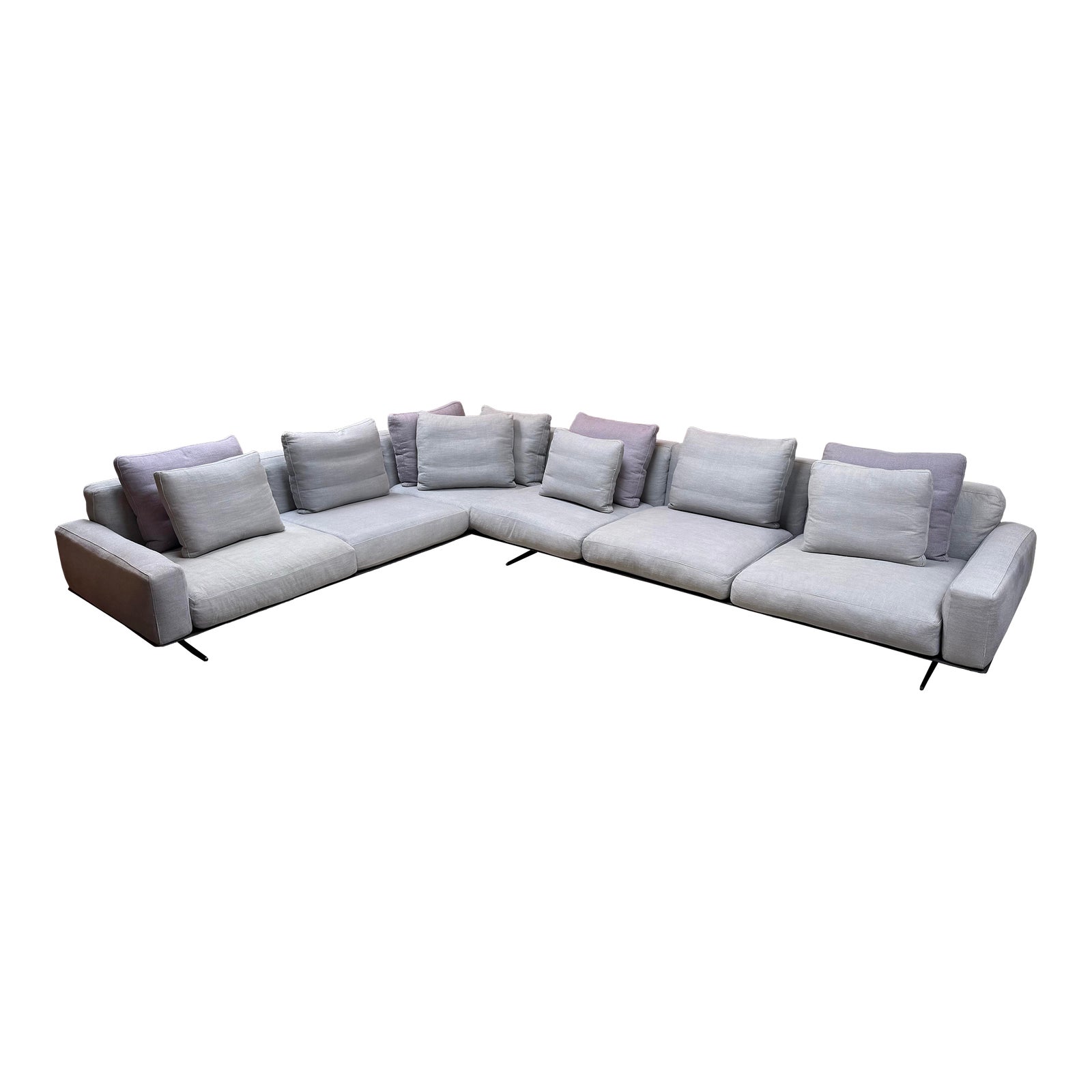 Design Plus Gallery presents the Soft Dream Sectional by Antonio Citterio for Flexform. The seating arrangement is versatile, flexible, and chameleon-like – this is the personality of the Soft Dream sectional sofa series. Frame and seat frame in metal covered with chocolate brown hide leathern. The removable upholstery covers show significant wear and can be replaced with Flexform or cleaned professionally. The sectional has a total of six seat cushions with numerous seat back cushions in matching light gray with a blend of muted lavender pillows. The sectional is overall in good condition with either cleaning or replacement for near perfection in your home.