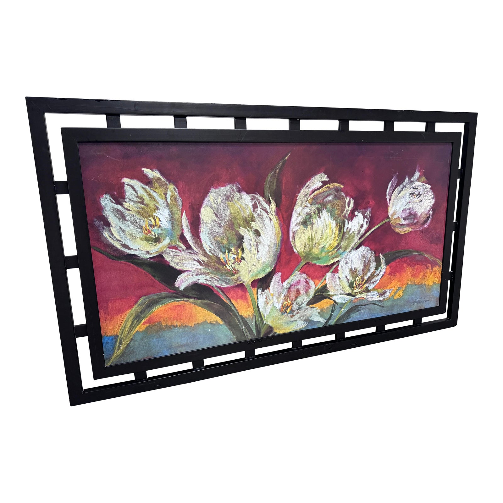 Design Plus Gallery presents a Floral Artwork with a Unique Black Metal Frame, Signed by Artist. The artwork has five white tulips that all going in differing directions, possibly blowing in the wind. The background has bold colors going from reds to blues. Very nice and large composition artwork to steal the show wherever it is placed in the home. Good conditions, minimal wear to the artwork and frame. Wear on the frame.