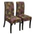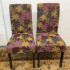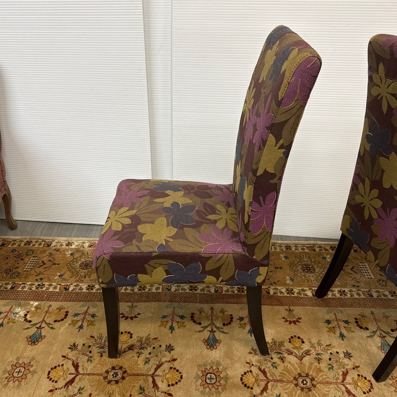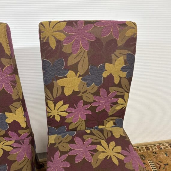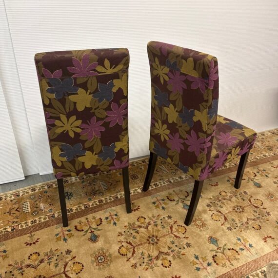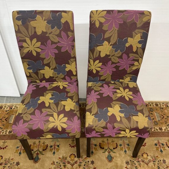 Design Plus Gallery presents a Pair of Floral Printed Side Dining Chairs. The duo sparks a sense of whimsy in their easy to coordinate tones of aubergine, chartreuse and dark brown flower print. The tones of the fabric are a great match to the espresso stain of the wooden legs. The chairs are in good overall condition for their usage.