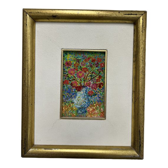 Design Plus Gallery presents a Flores Gold Framed Original Peruvian Artwork. This artwork mostly uses dots to depict a bouquet of flowers in a bluish white vase. The art is single-matted and framed in wood with a gold finish. A hanging cord is attached in the back. Minor wear from use; painting is in good condition. Originally purchased in Peru.
