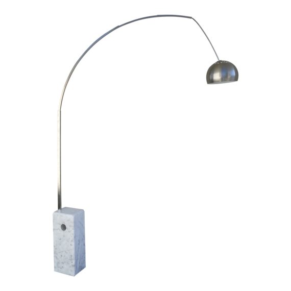 Design Plus Gallery presents an Arc Style Floor Lamp attributed to Flos. The floor lamp cleverly provides overhead lighting without requiring ceiling suspension, its spun stainless shade extending nearly seven feet to accommodate a dining table or sofa beneath the light source. Since 78-pounds of grey veined white marble is difficult to move, the designers smartly placed a hole in the base to accommodate a broom handle for lifting. The adjustable arc (damaged at end) has a swiveling shade for precise lighting control. Step switch on cord. Light evidence of damage as shown; fair condition.