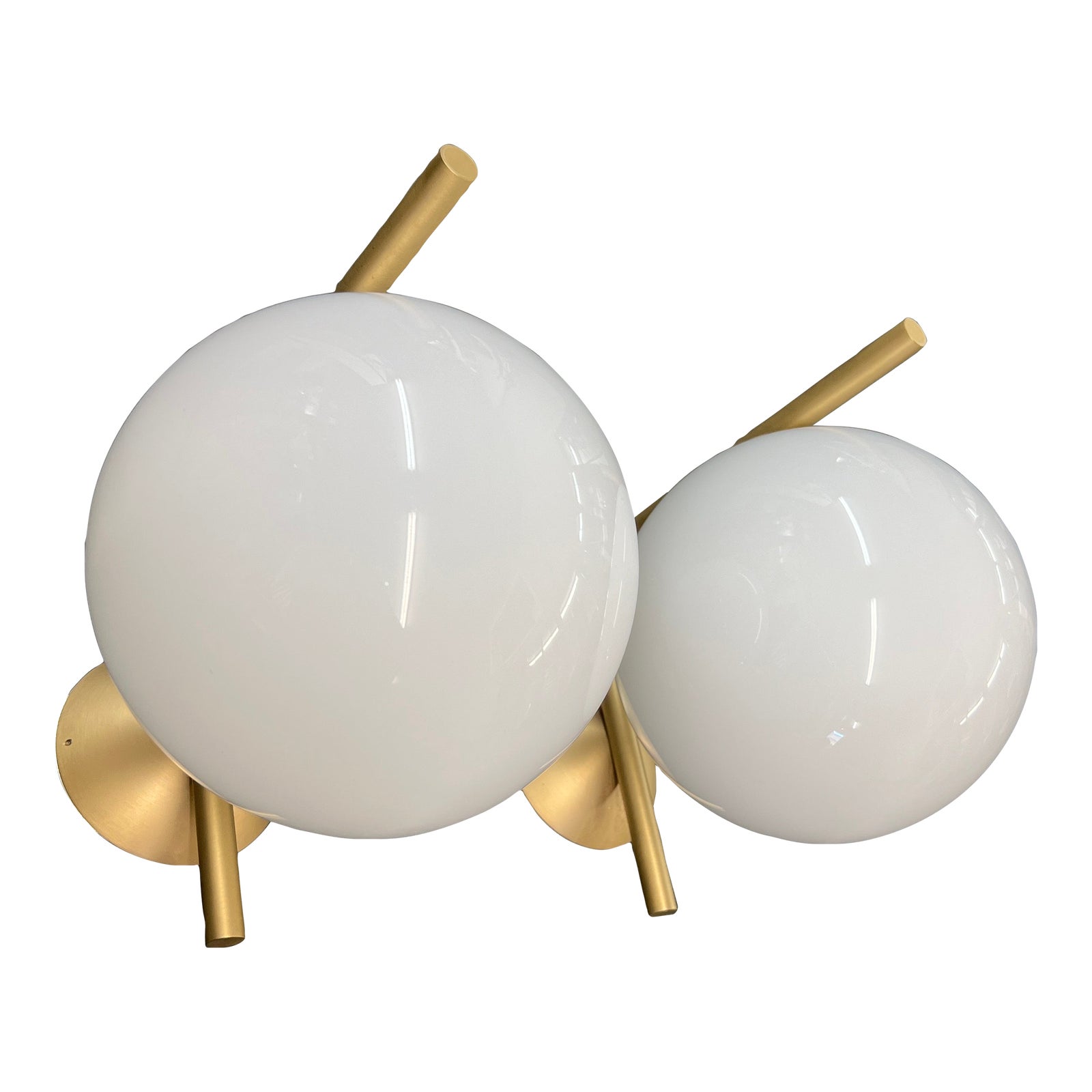 Design Plus Gallery presents a Pair of IC Globe Sconces by Flos. Designed by Michael Anastassiades and made in Italy, the pair are simple elegance. A large opal glass globe is suspended by in simple brushed brass for light when and where you need it. Looking fabulous as sconces or ceiling lights, the diffused halogen lights are “spot” on. Little evidence of wear; condition is consistent with age and use.