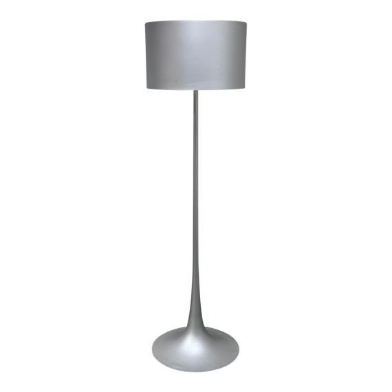Design Plus Gallery presents Spun Light F Floor Lamp by FLOS. The floor lamp is carefully fabricated out of spun metal, the form of the drum-shaped shade and tapered base is inspired by the graceful aesthetic possibilities of fluid dynamics. FLOS is an Italian lighting company continues to do so to this day by collaborating with talented international designers and researching the latest lighting technologies and materials. Resulting FLOS lighting fixtures are daring and provocative, yet uphold the fundamental principles of good design. Discontinued color in Silver. Is in good condition with minimal surface wear.
