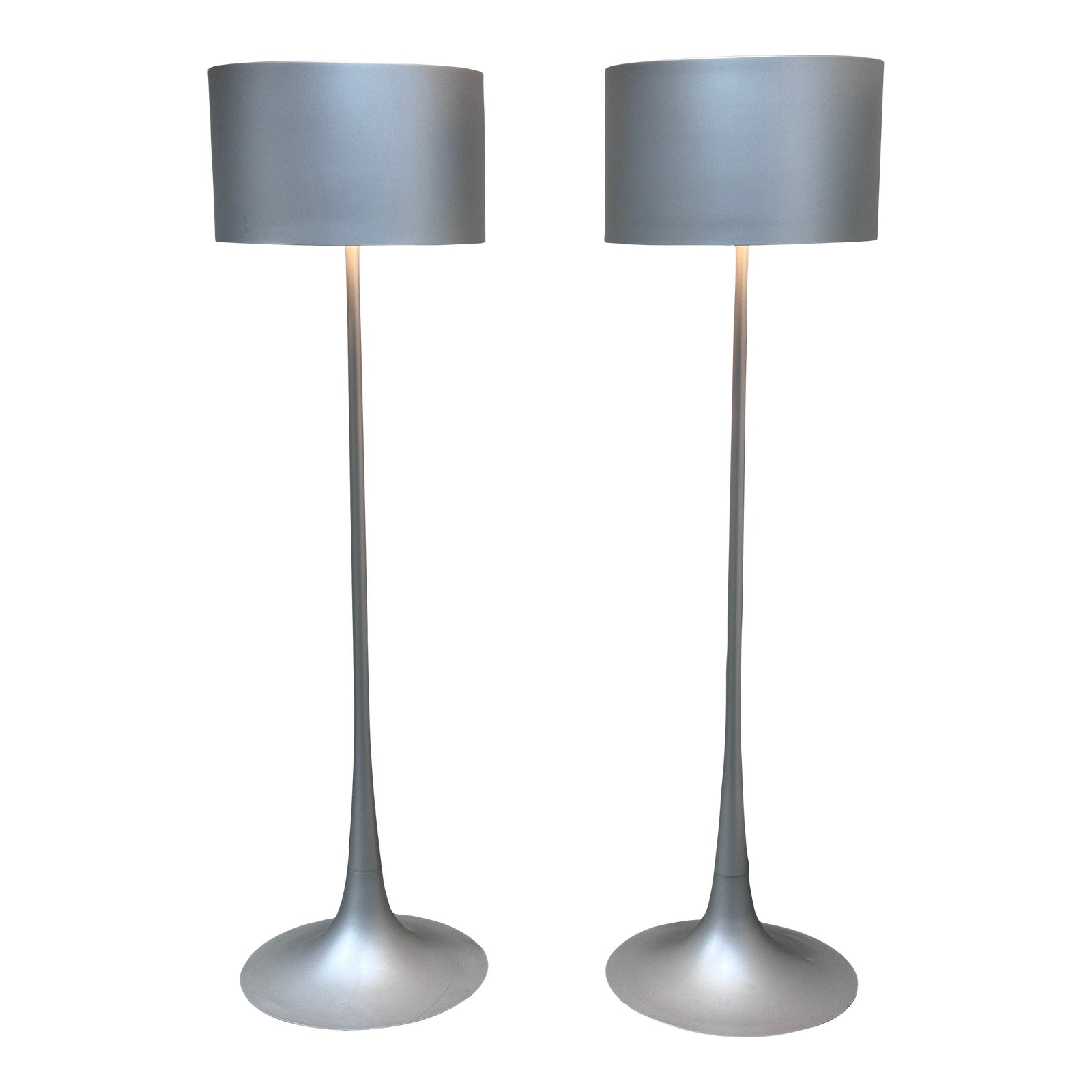 Design Plus Gallery presents a Pair of Spun Light F Floor Lamps by FLOS. These floor lamp are carefully fabricated out of spun metal, the form of the drum-shaped shade and tapered base is inspired by the graceful aesthetic possibilities of fluid dynamics. FLOS is an Italian lighting company continues to do so to this day by collaborating with talented international designers and researching the latest lighting technologies and materials. Resulting FLOS lighting fixtures are daring and provocative, yet uphold the fundamental principles of good design. Discontinued color in Silver. They are in good condition with minimal surface wear.