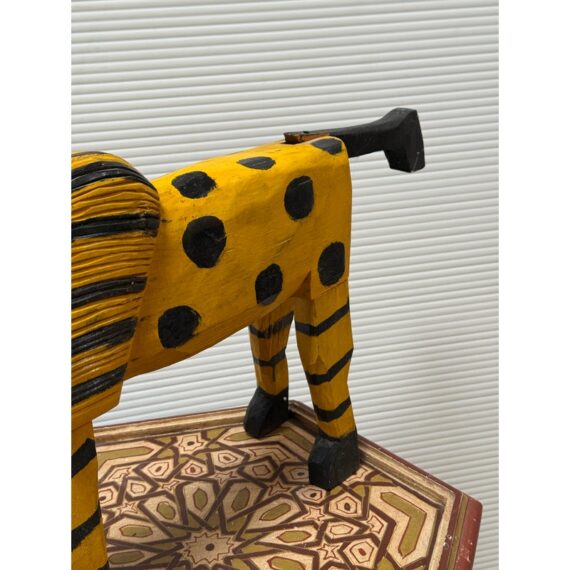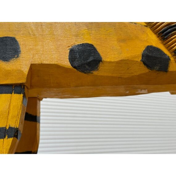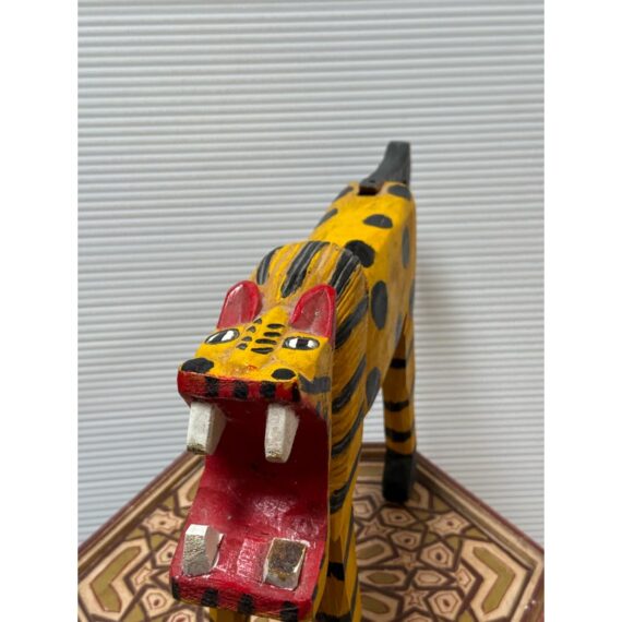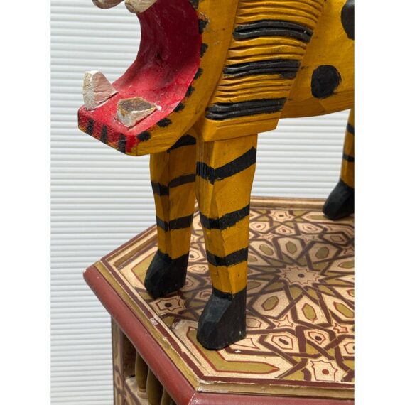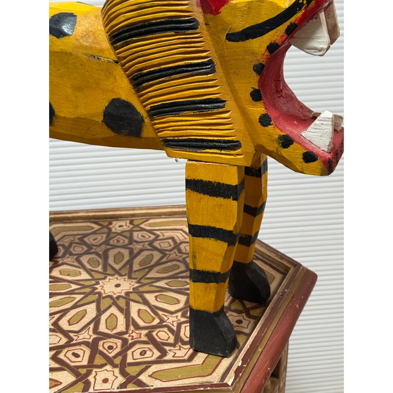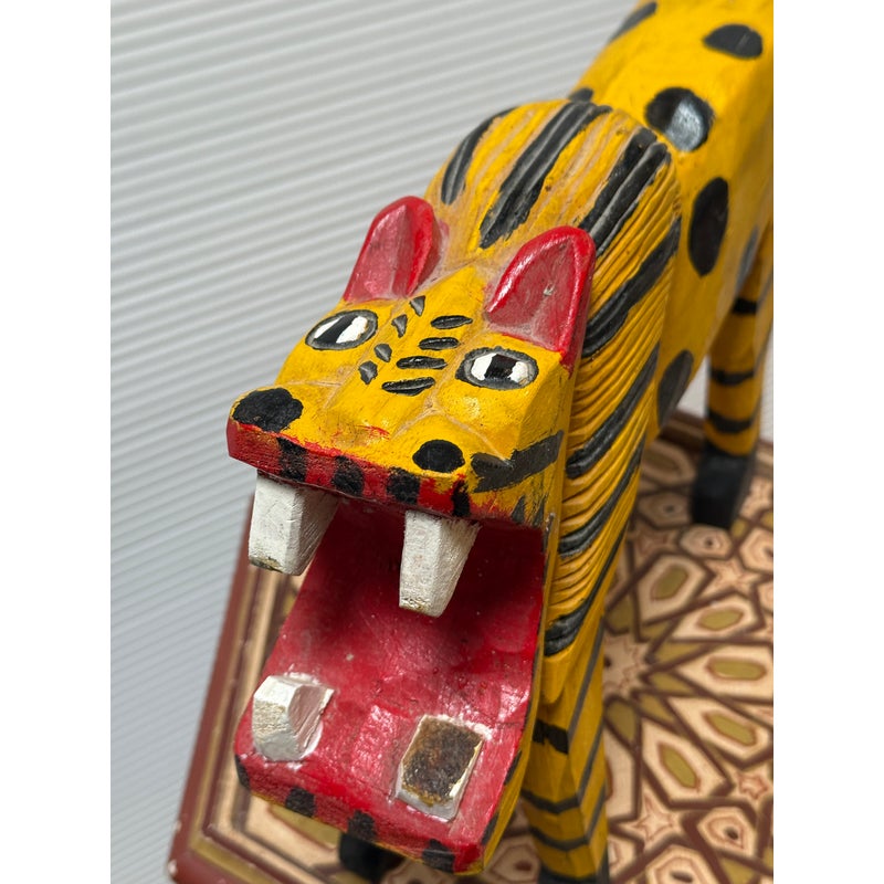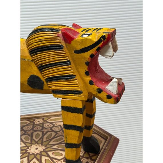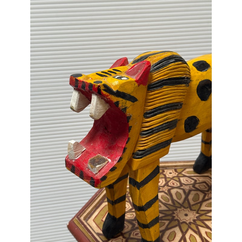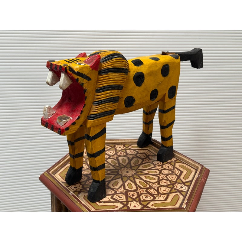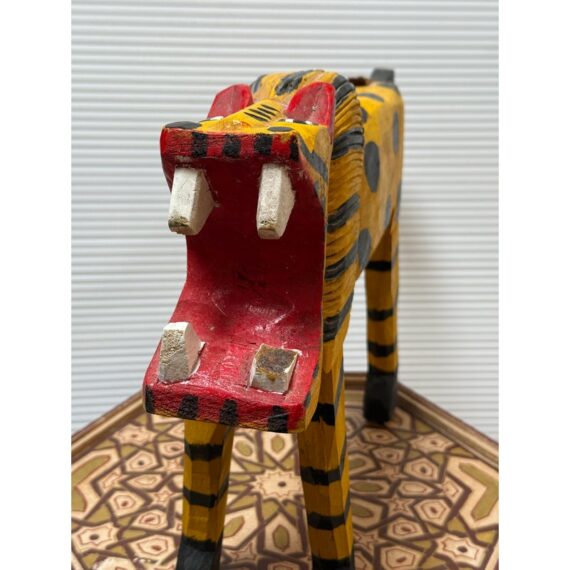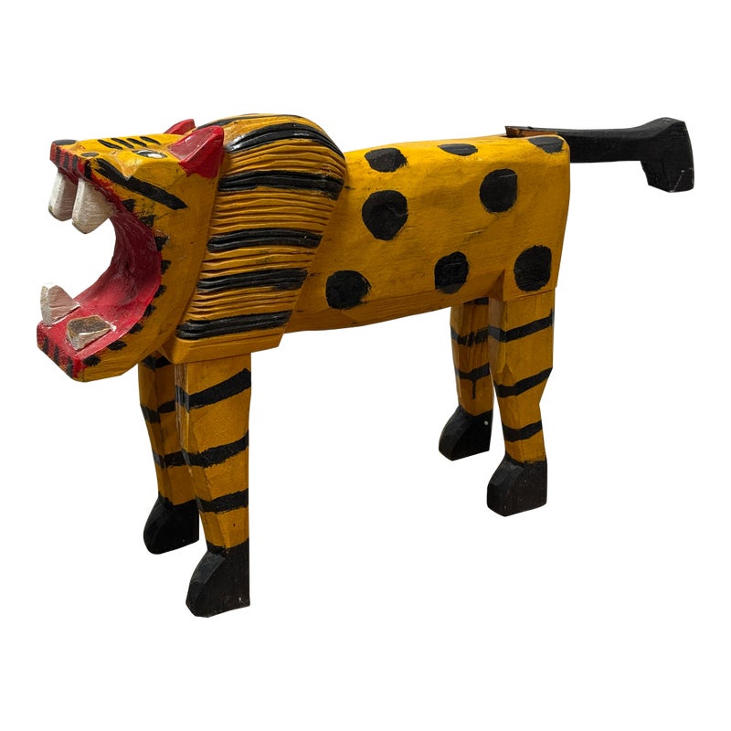 Design Plus Gallery presents a Hand Carved + Painted Striped Tiger from a Folk Artist. Such a striking animal that we, as a race in general, take advantage of. The piece will bring you great joy + appreciation for all they offer us, not to mention their cuteness. This sculpture is made from carved wood and painted with blacks stripes + spots.Their mouth is wide revealing a red mouth with bright white teeth. Is in good condition for its usage.