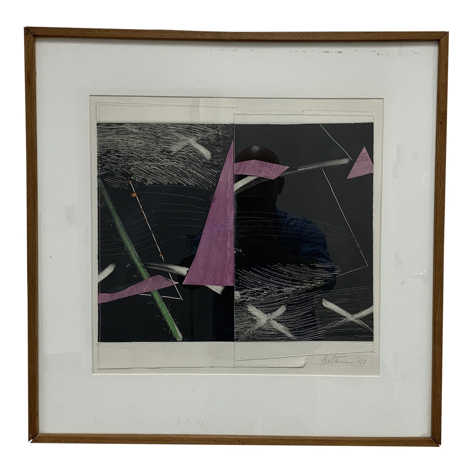 Design Plus Gallery presents a Original Custom Framed Footman Art On Paper. Signed by the artist in the lower right corner in graphite 1981. Stitch work is assembled with paint and pieces of paper in collage. Pink + green are subtly added to the mostly black and white palette. Custom framed with matte and walnut stained oak frame.