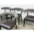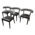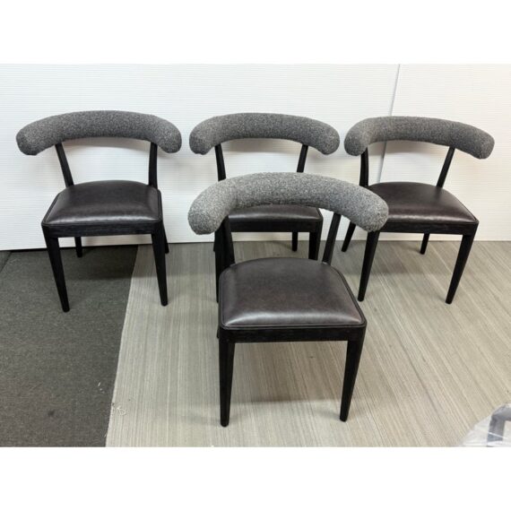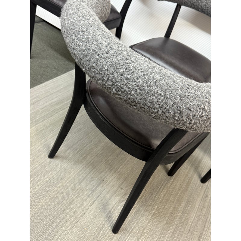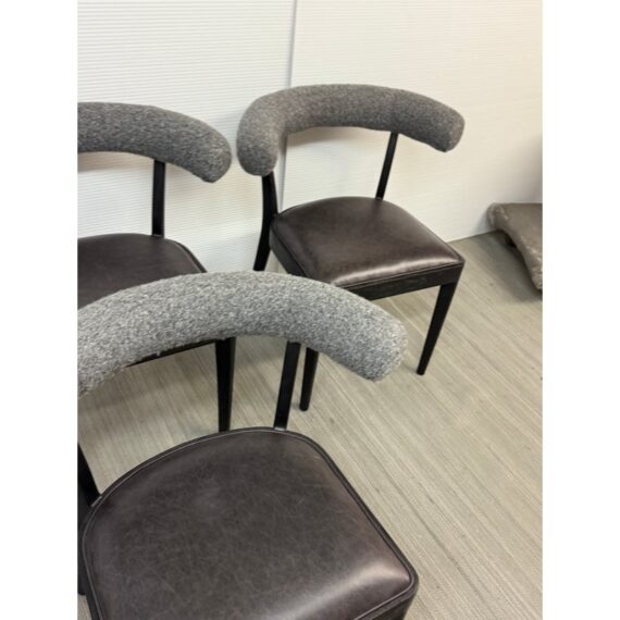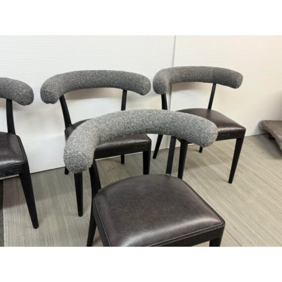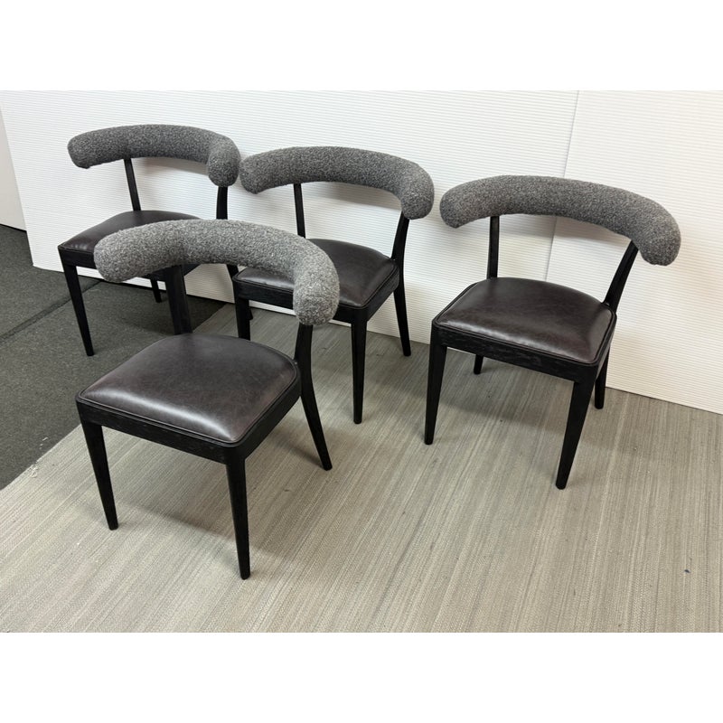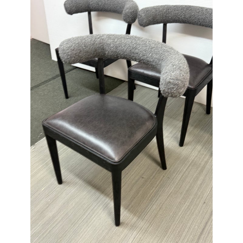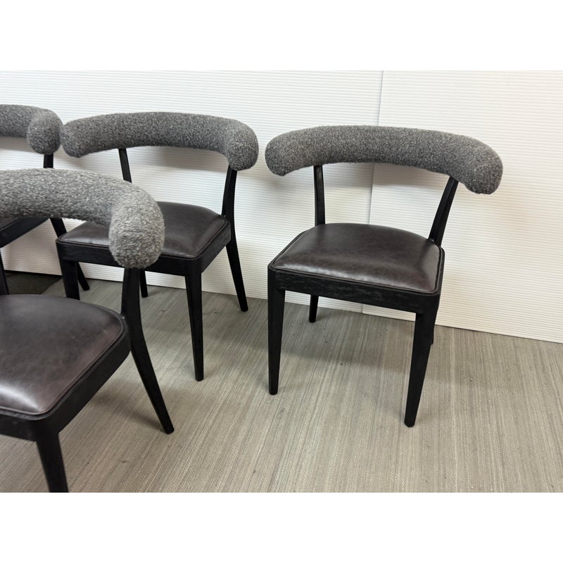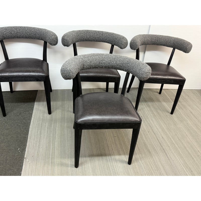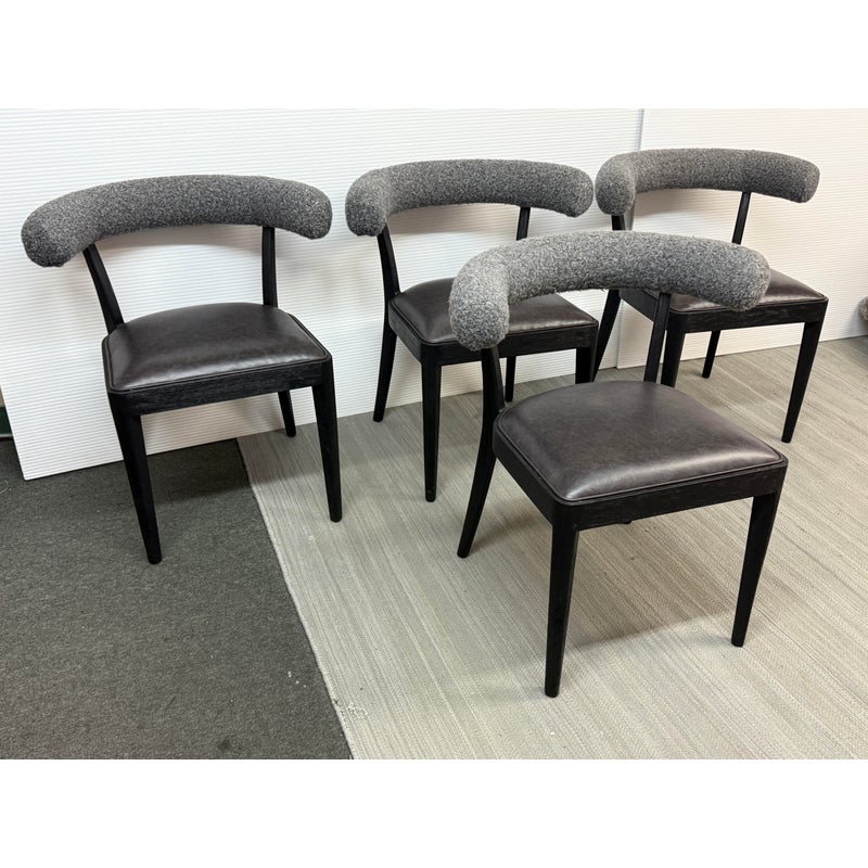 Design Plus Gallery presents a Set of Four Adante Dining Chairs from Four Hands. The chairs have a slim-profile with seats that are upholstered in a black top-grain leather. Each are framed with a matte black finish on parawood. A daphne grey finish sheepskin-wrapped back makes for a sleek, monochromatic look. In good condition, visible and minimal wear.