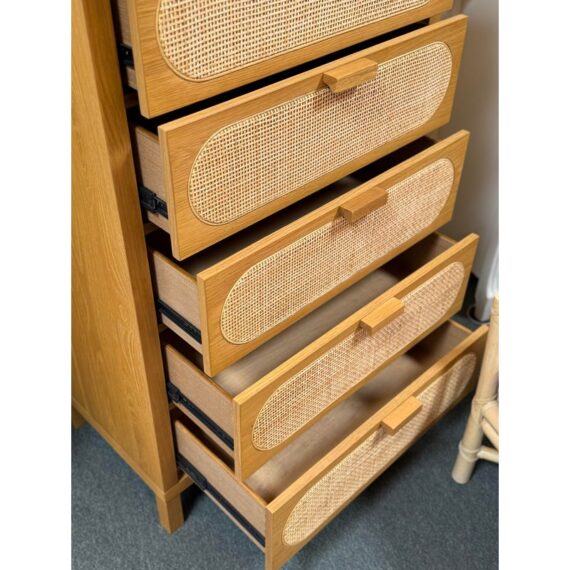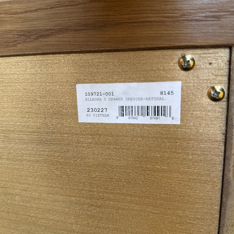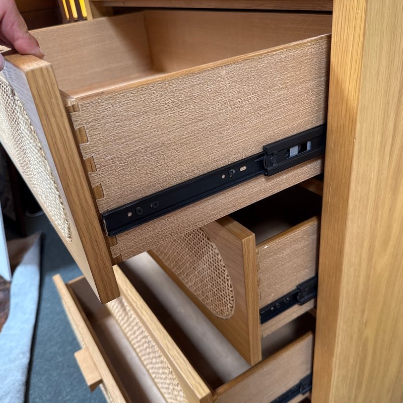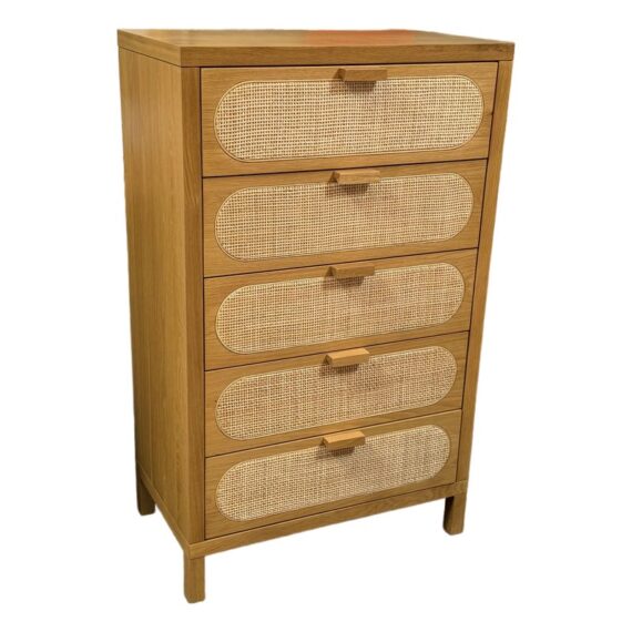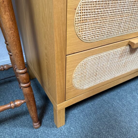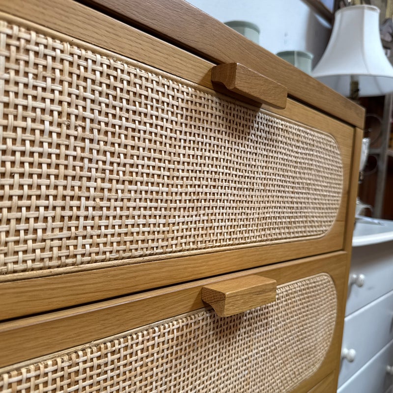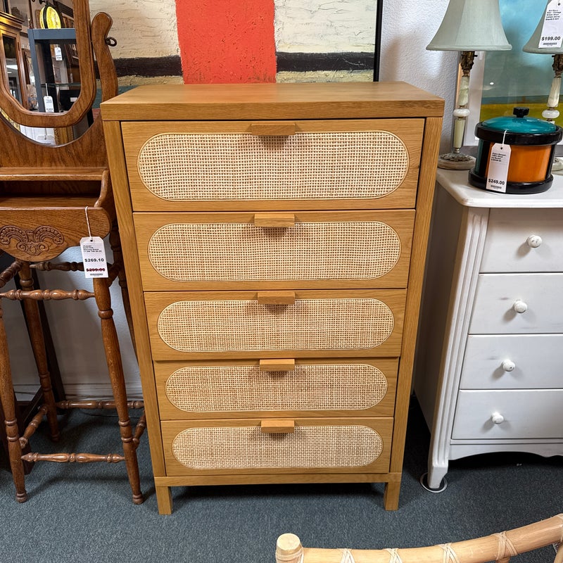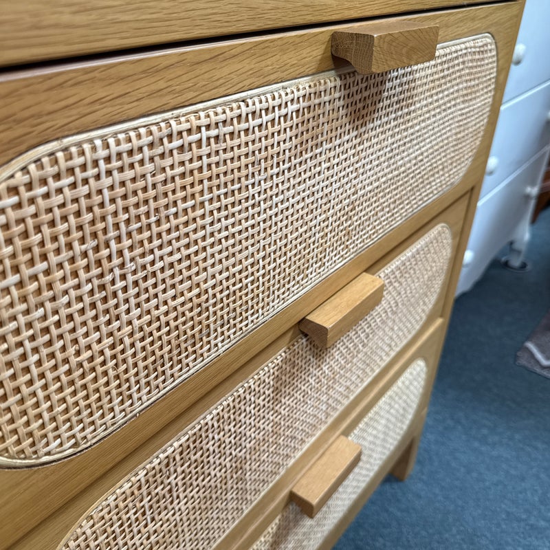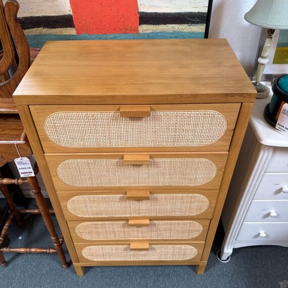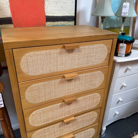 Design Plus Gallery presents the Allegra Dresser from Four Hands. This au naturale dresser fits the style of organic danish modern design with its use of cane on the drawer fronts. The dresser has a honey-finished oak wood and welcomes five spacious drawers with wood-backed cane paneling, for a soft, neutral look with lasting modernity. The dresser is in good condition for its usage.