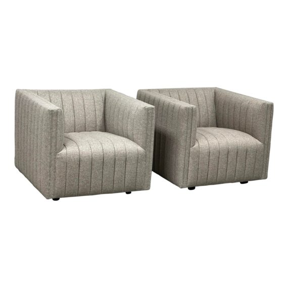 Design Plus Gallery presents a Pair of Augustine Swivel Chairs by Four Hands. A modern take on a classic library chair, neutral seating with subtle herringbone pattern adopts dramatic channeling for trend-forward texture and sumptuous sit. Swivel feature amps up fresh appeal from every angle. The color upholstery is a Orly natural fabric. Good Condition, minor wear from usage.