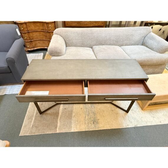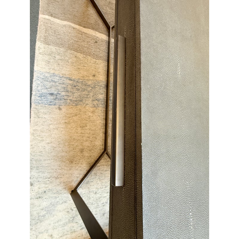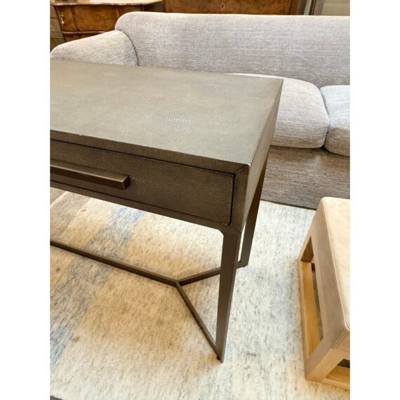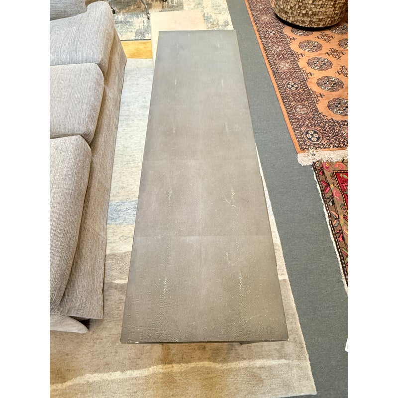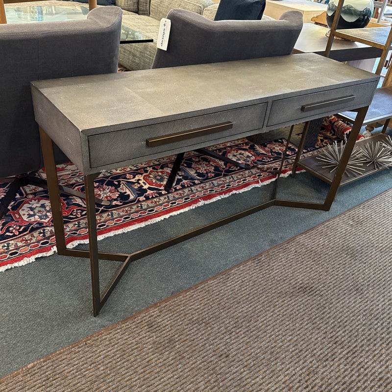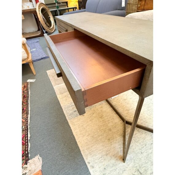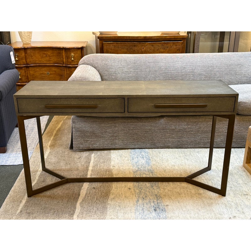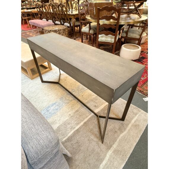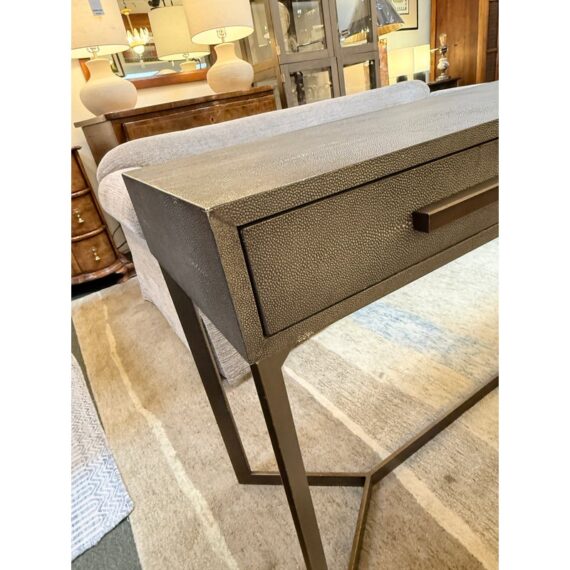 Design Plus Gallery presents a Bentley Console from Four Hands. The console is made from the use of brushed brass and has a shallow drawer with a faux shagreen surface. The height of the piece allows it to be positioned behind a large sofa for lamps, in a hallway as a drop zone, or to anchor an accent wall with decorative accessories. Minor wear on corners, condition is consistent with age and use. Made in Vietnam.