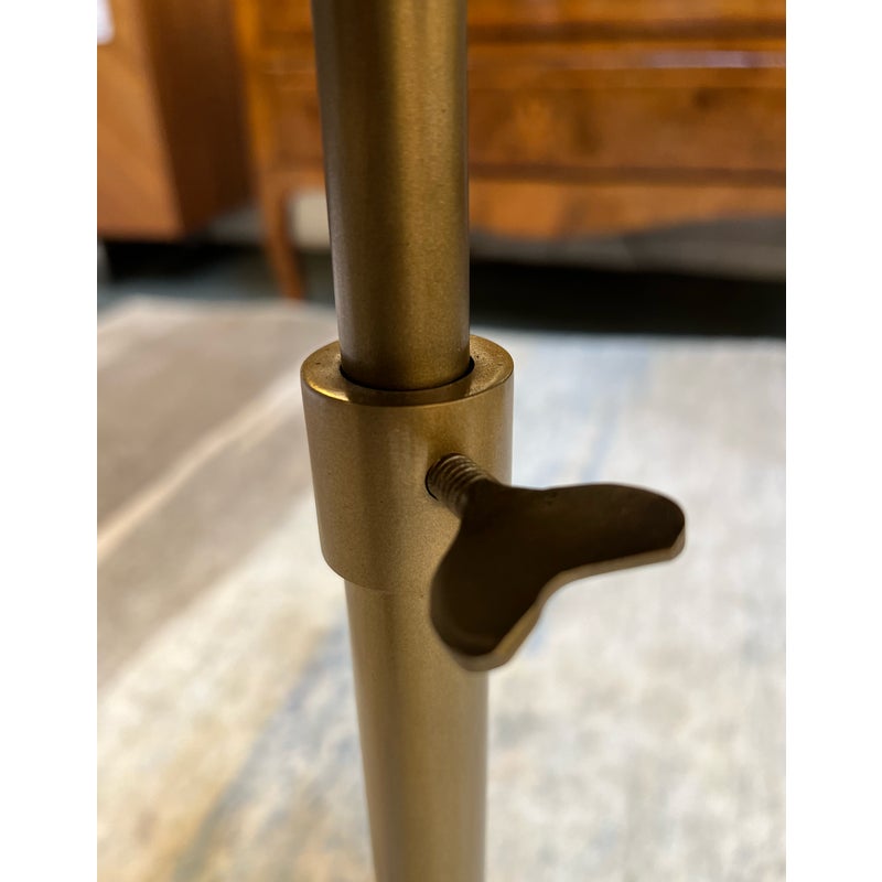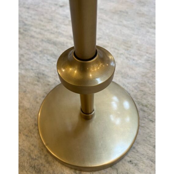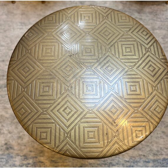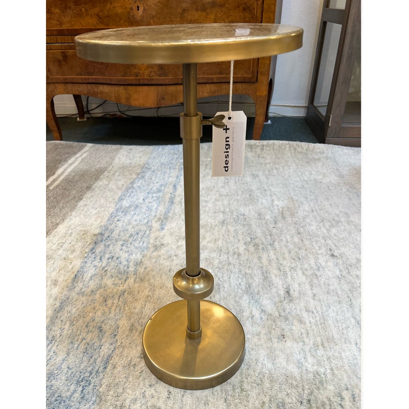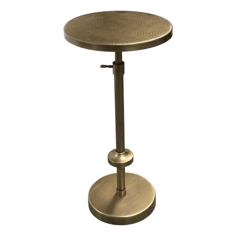 Design Plus Gallery presents the Eileen Adjustable Accent Table from Four Hands. This petite side table mixes effortlessly into living spaces, from the soft + feminine to the starkly modern. There is etched or stamped geometric details that add character to antiqued brass finish. This height-adjustable accent table will create an extra surface anywhere needed. Light surface wear; condition is consistent with age and use.