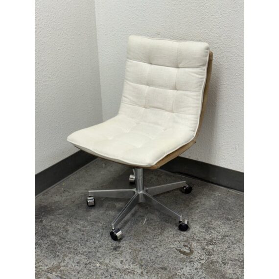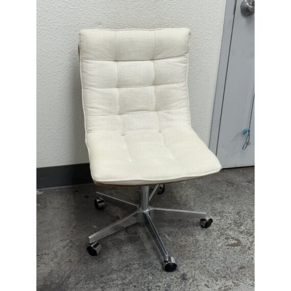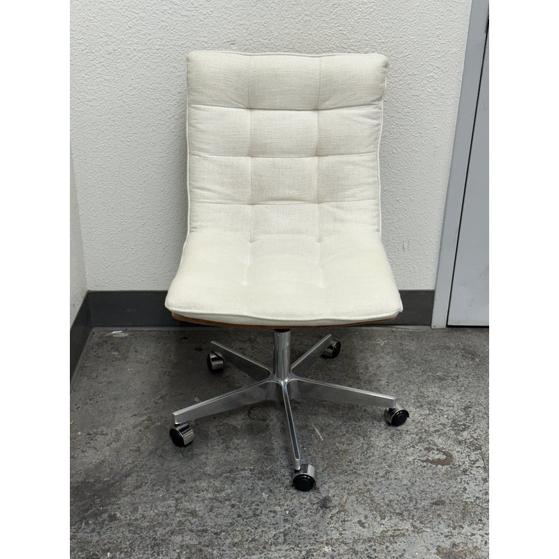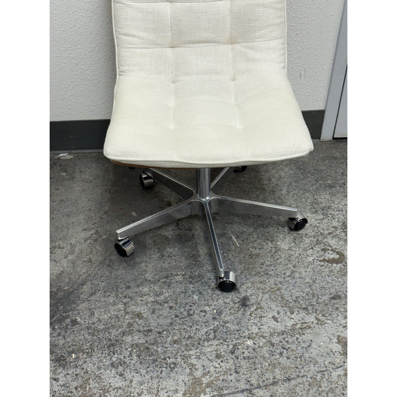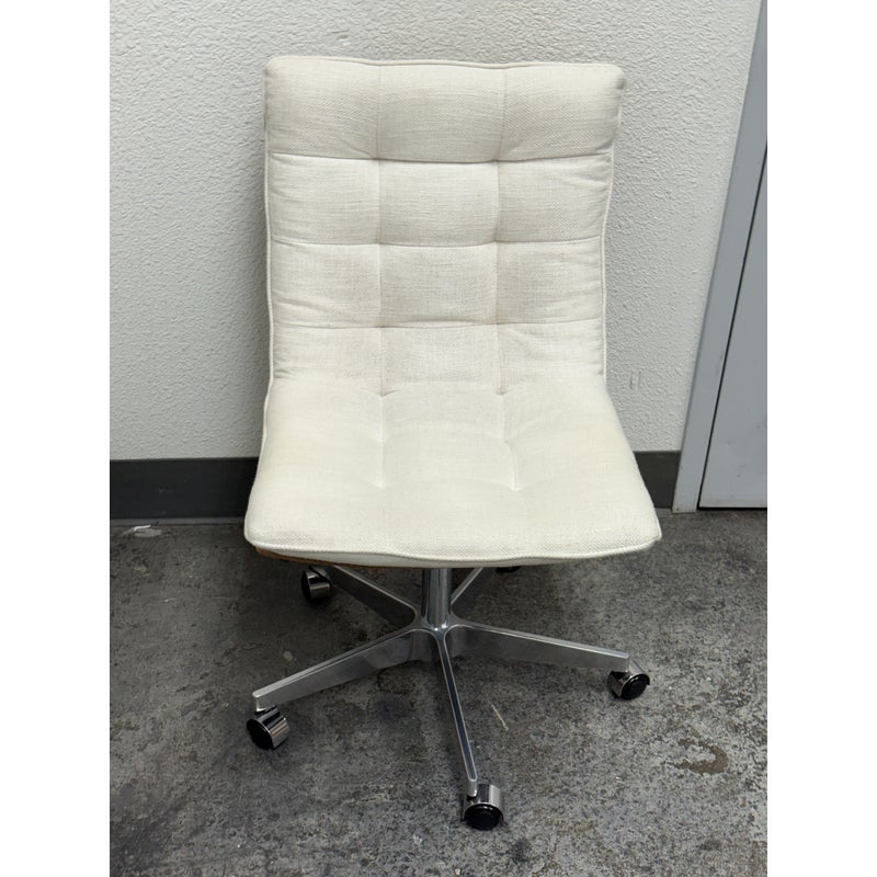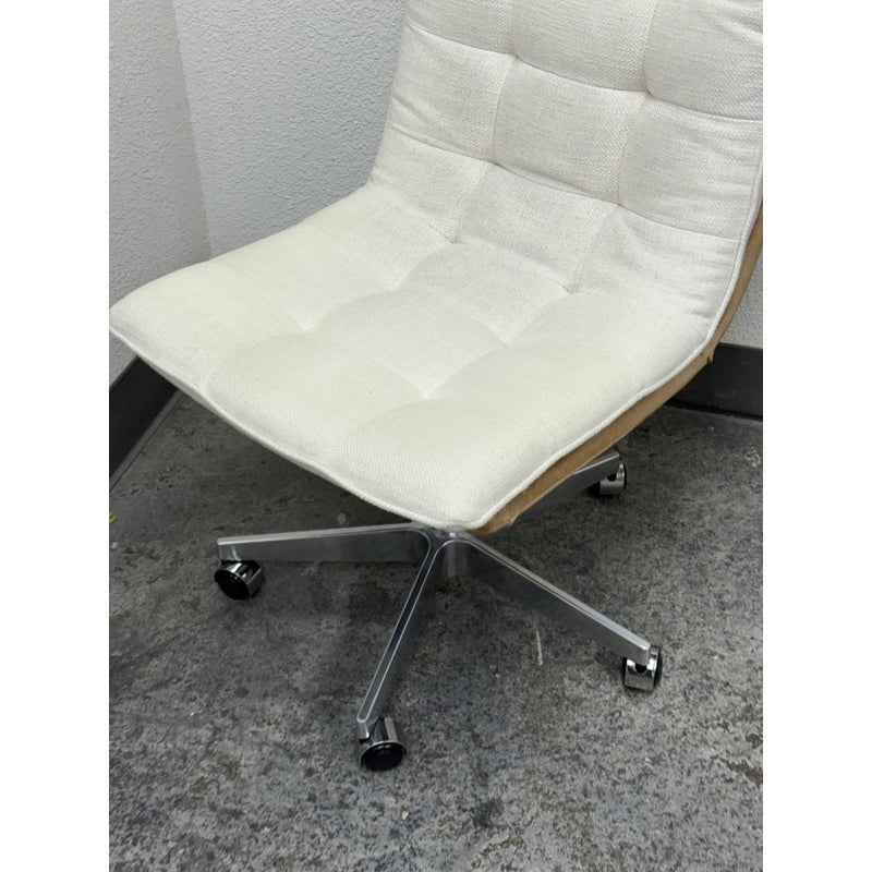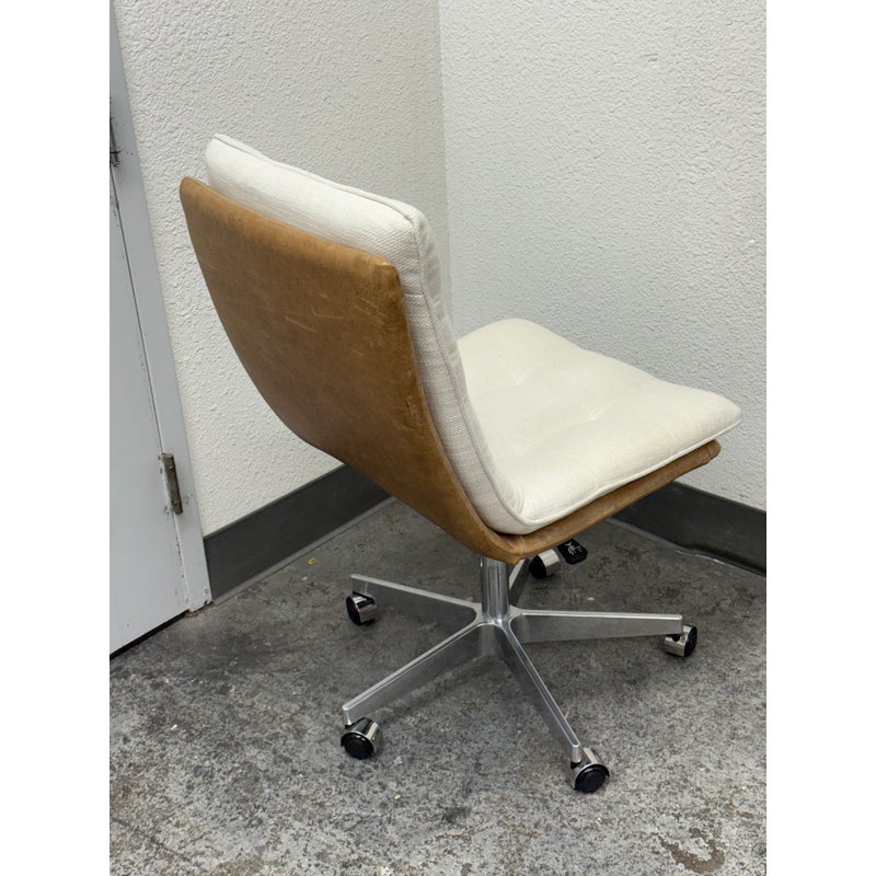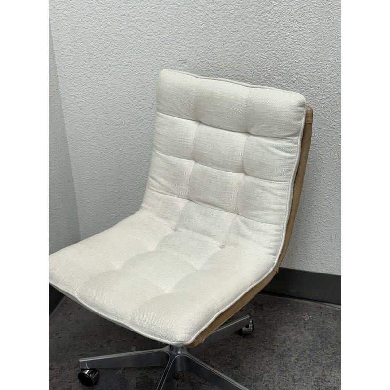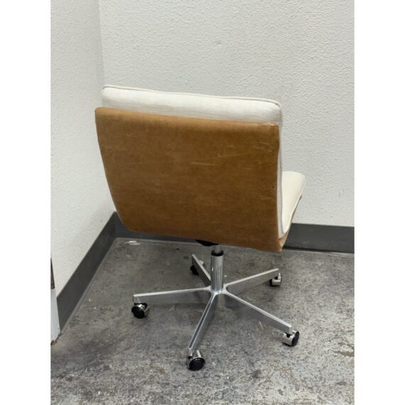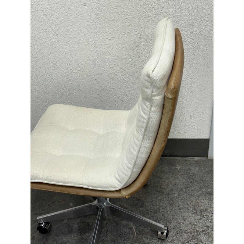 Design Plus Gallery presents the Bilbao Office Chair by Four Hands from Lulu & Georgia. The fashion-forward material mix of this office chair makes for charming, hip vibes and evolves the look of your workspace. With shallow tufting for texture, its cream linen-blend cushion tops a tan top-grain leather seat and back. A sturdy aluminum base, casters, and adjustable seat bring total ease to your modern home office. Is in good condition with visible and minimal wear from usage.