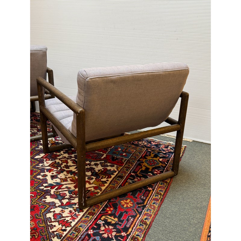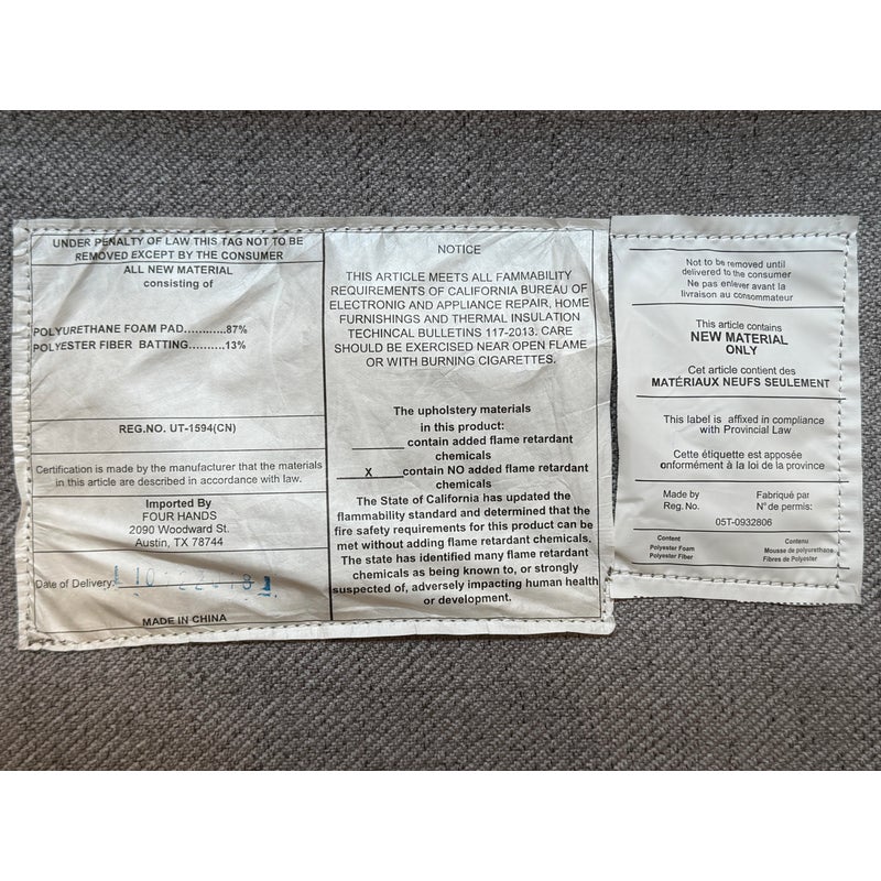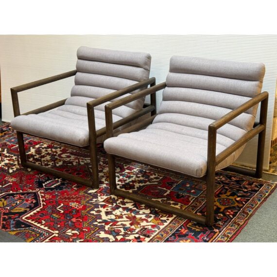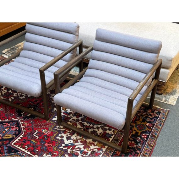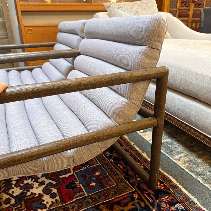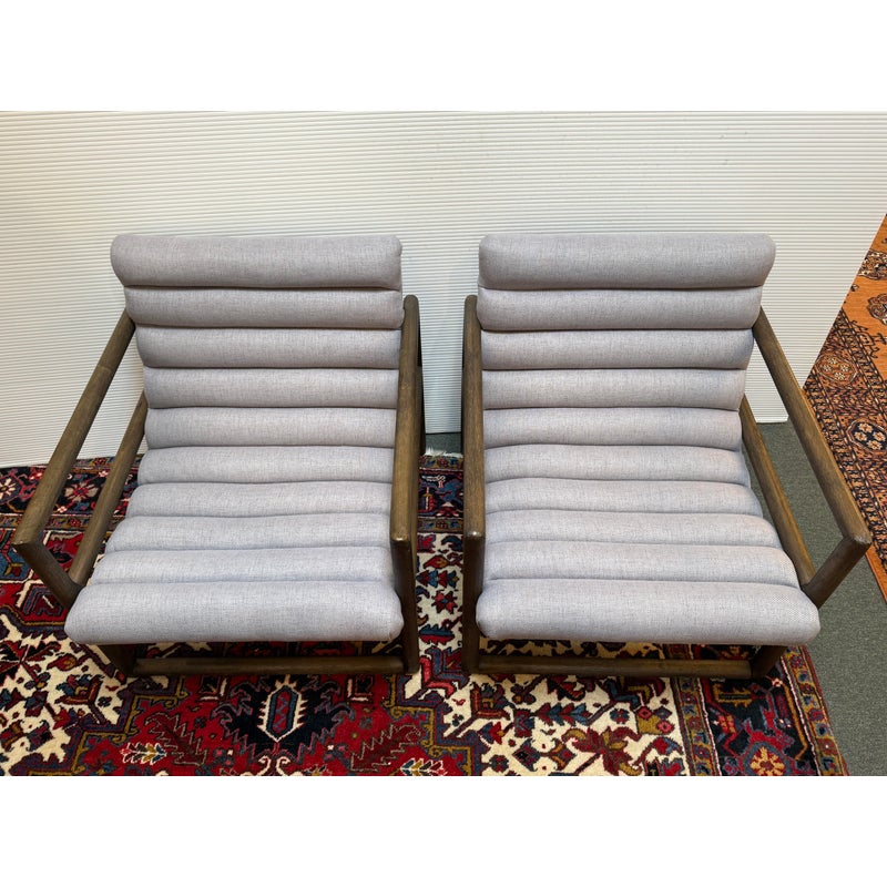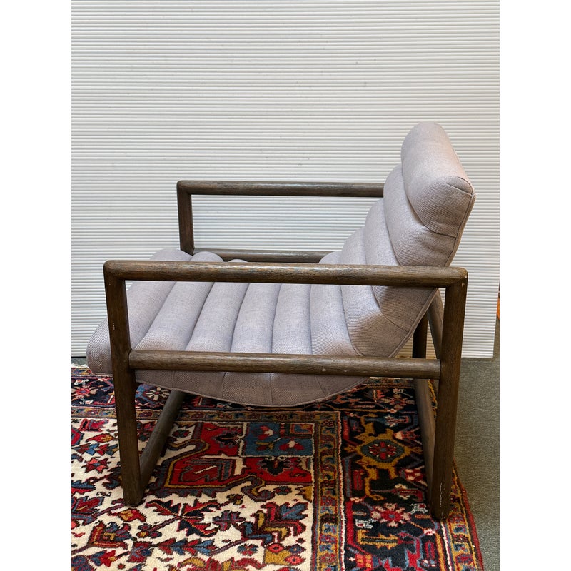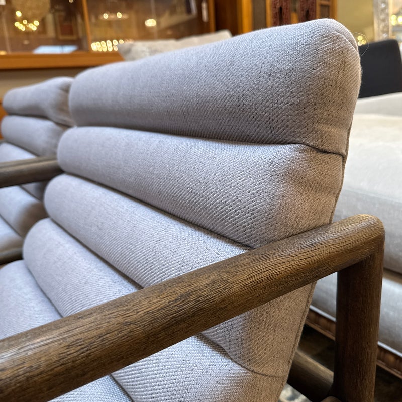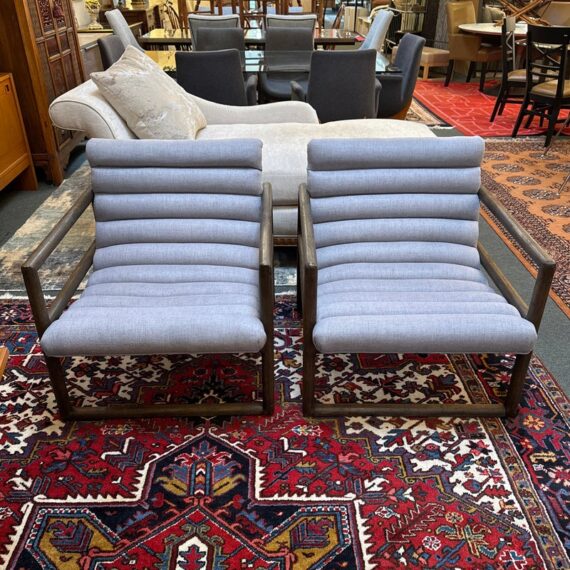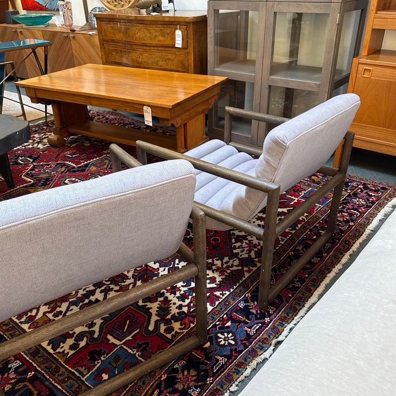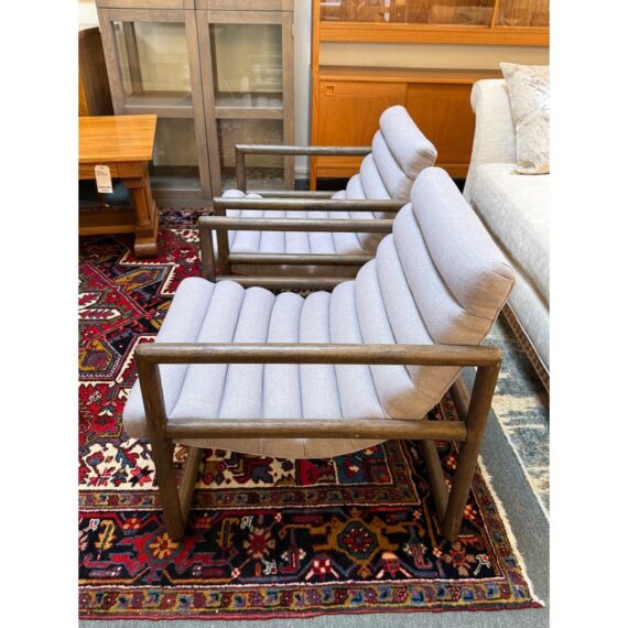 Design Plus Gallery presents a Pair of Kensington Fitz Arm Chairs from Four Hands. Invitingly curved woven upholstery the brands Axis Silver upholstery that is the, framed to wonderful effect. Horizontal channeling plus squared off, repetitive lines create alluring negative and positive spaces, while wire-brushed parawood lends a warm, vintage vibes to this perfectly angled accent chair. Simple elegance and romance. Each piece is made from hardwoods with handcrafted curves and detailed carving. In good condition, visible and minimal wear from usage.