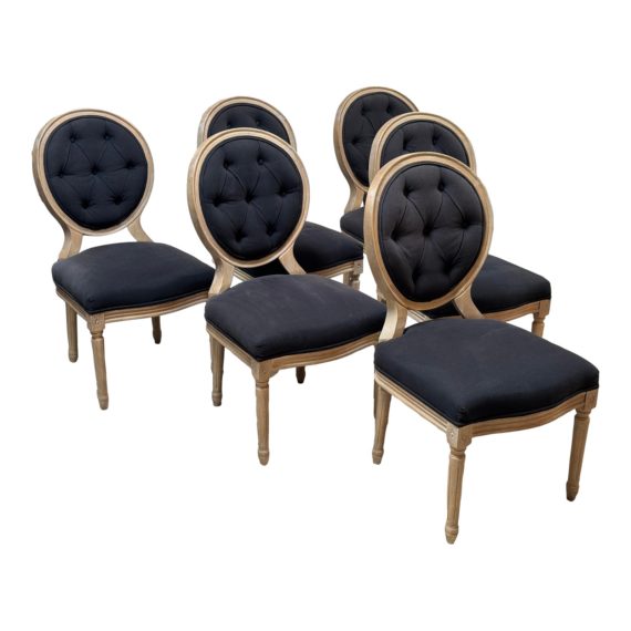 Design Plus Gallery presents a set of Six Stella Chairs by Four Hands. An elegant design features a sturdy wood frame with turned legs and molded apron in a natural finish. The generously-sized seat and oval-shaped backrest are fitted with thick cushions and come upholstered in a black upholstery. For added visual flair, the back is embellished with plush button tufting. Visible yet minor wear that is consistent with use + age.