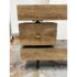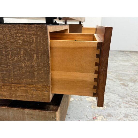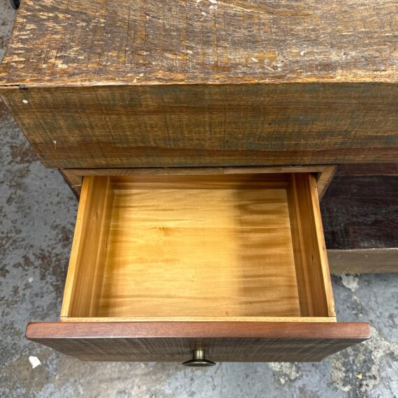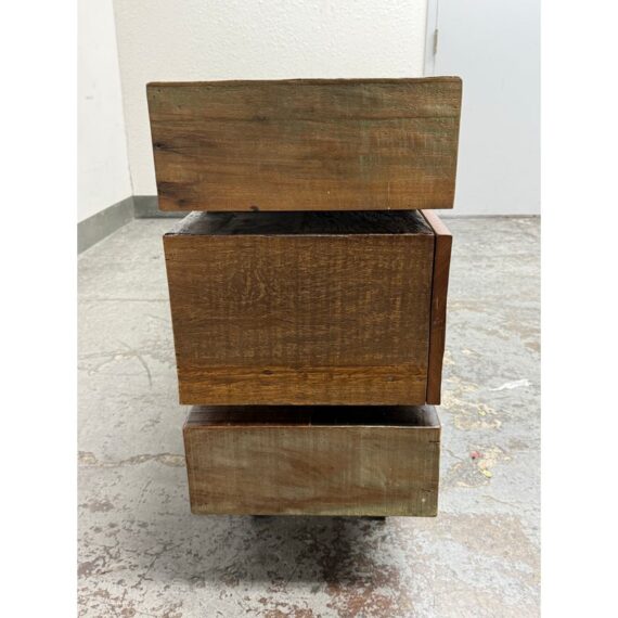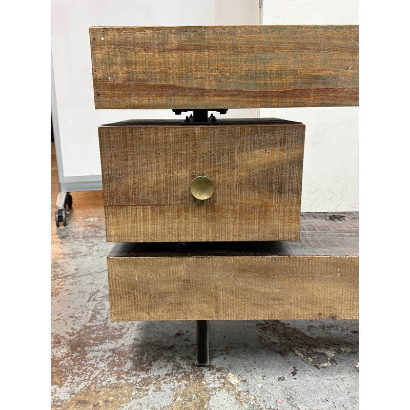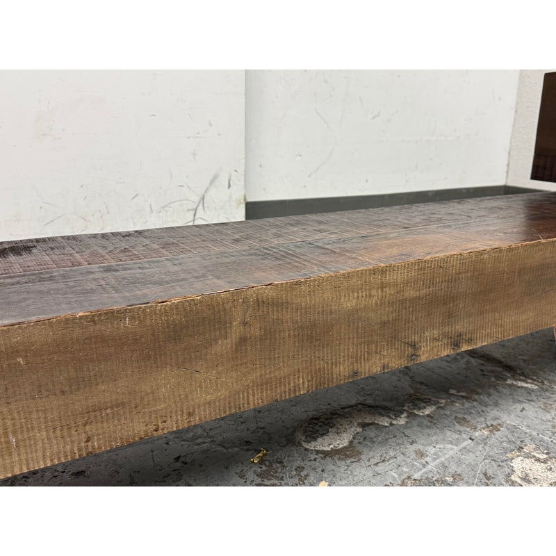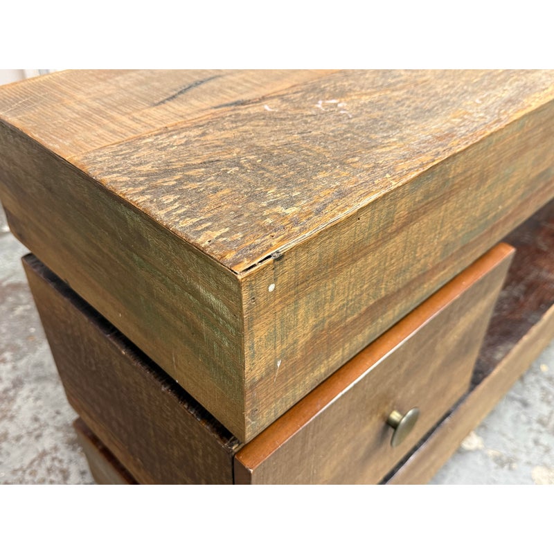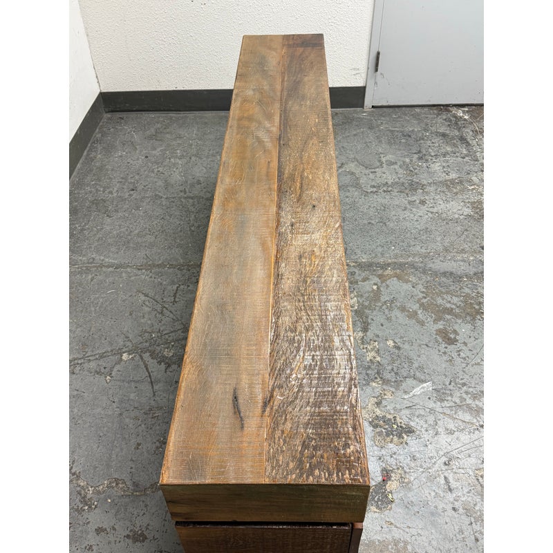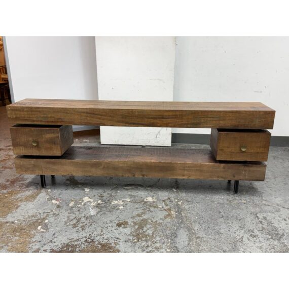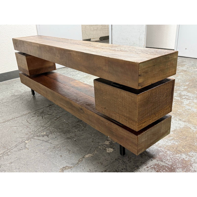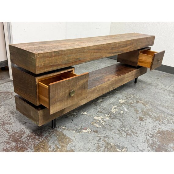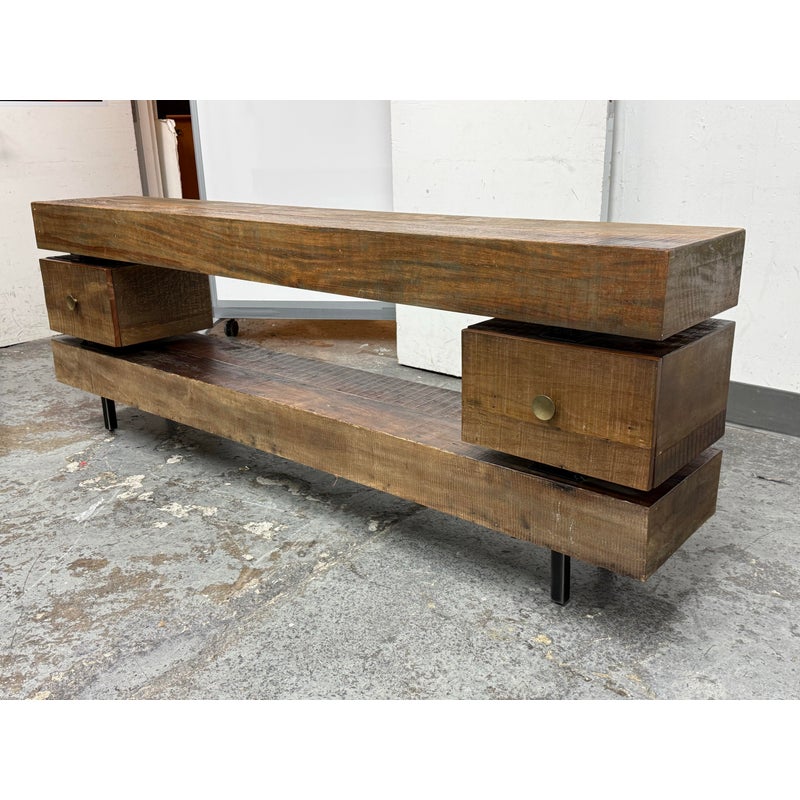 Design Plus Gallery presents a Dillon Console Table from Four Hands. From the Bina Collection. Long and lean with undeniable presence, the Dillon Console delivers stylish storage in a slender profile. Stacked, contrasting planes of American walnut, peroba, and cruzeta woods seem to hover in formation above airy iron supports, while rounded brass hardware lends a soft, refined touch. Two dovetail drawers to keep everyday essentials neatly tucked away. Handcrafted from a thoughtful mix of sustainably harvested and reclaimed woods, Dillon layers rough and refined textures with time-worn patinas for a rustic‑modern look that bridges old and new. Because the materials are reclaimed, subtle variations in grain, color, and tone make each piece truly one of a kind. Simple yet sculptural, this long, narrow console feels light in the room and blends beautifully with a range of decorating styles—perfect for entryways, hallways, or behind a sofa. This is a discontinued model. In good condition, visible and minimal wear from usage.