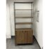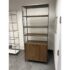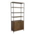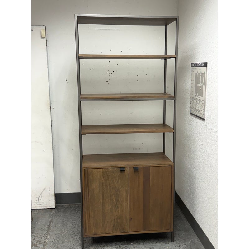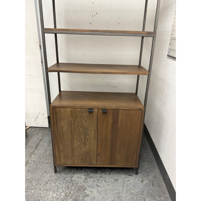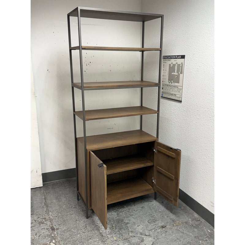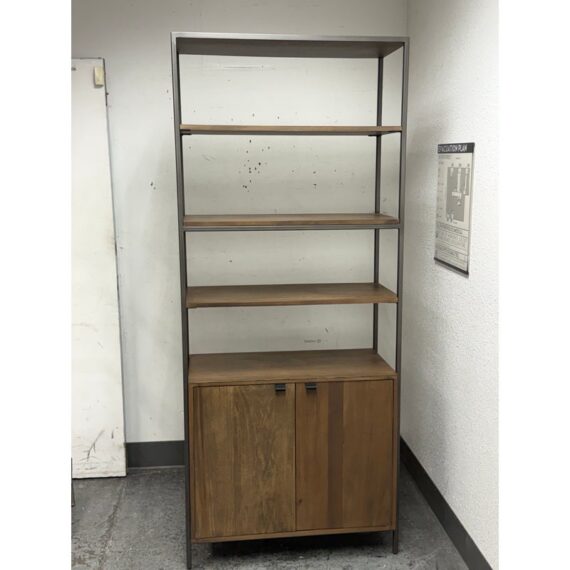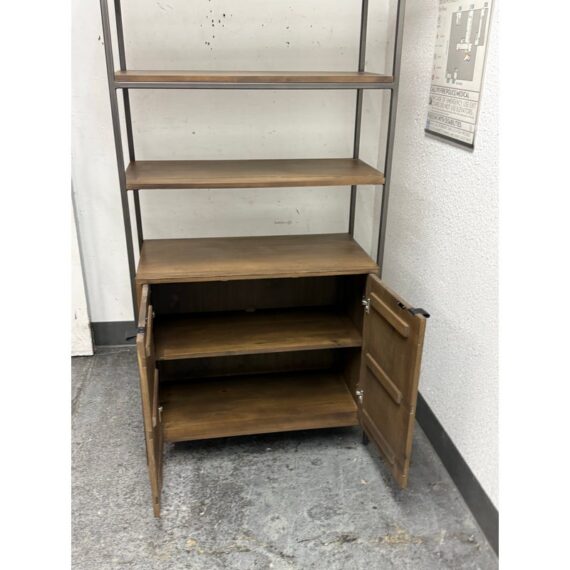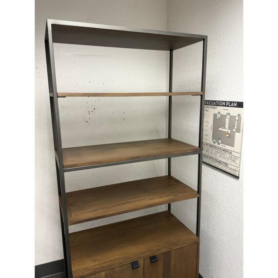 Design Plus Gallery presents a Trey Bookcase from Four Hands. Trey pairs midcentury-inspired lines with a poplar case in an auburn tone and a raw iron frame. The design offers four open shelves above a two-door cabinet, with an interior shelf for additional organization. Metal-secured leather pulls introduce subtle contrast against the wood fronts, while the slim iron base and squared supports keep the profile streamlined. It is in good, showroom like condition with minimal visible scratches from usage.