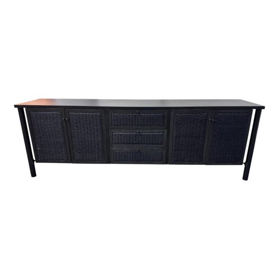 Design Plus Gallery presents a Veta Media Console. A modern weave pattern refreshes an ever-trending material. Solid black wash mango encases cane door fronts and drawers with a unique finish and textural basket weave. Dowel legs separate from casing for a float-like look. Minor wear. Missing shelving pegs. Made in India.