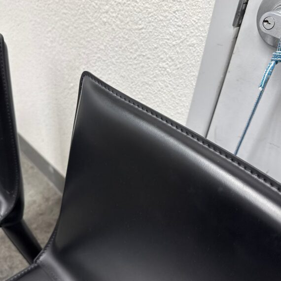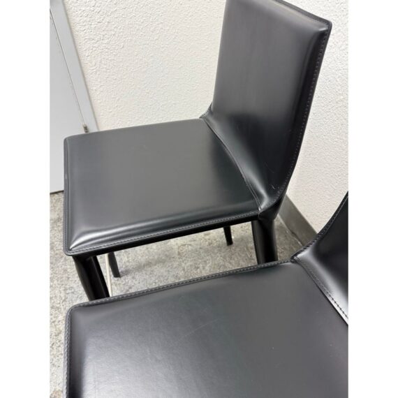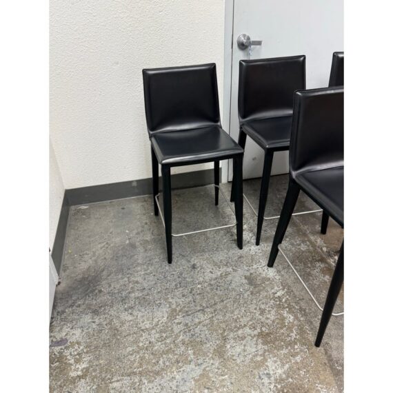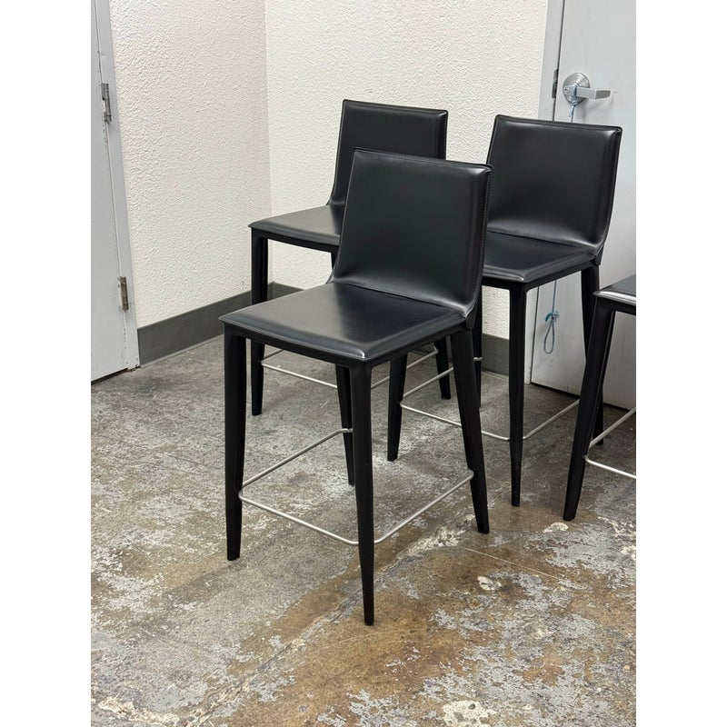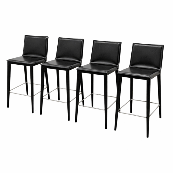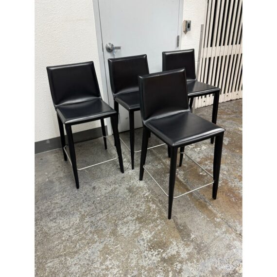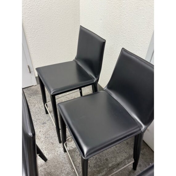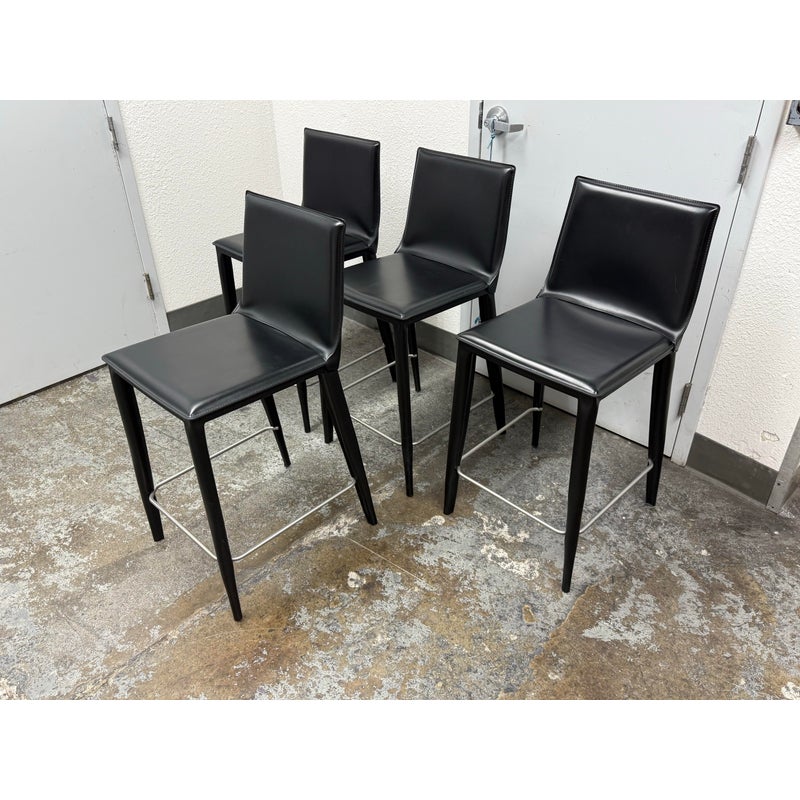 Design Plus Gallery presents a Set of Four of Bottega Counter Stools by Frag for Design Within Reach. This thoughtful seating design was first introduced in 2003 and is constructed with a harmonic steel seat back that flexes with you. Each stool is hand sewn in black leather over its slender yet durable steel frame. The seat is lightly padded so it’s comfortable for extended periods of use. They are in good condition with visible and minimal wear from their usage. Made in Italy.