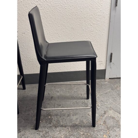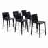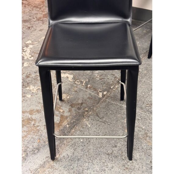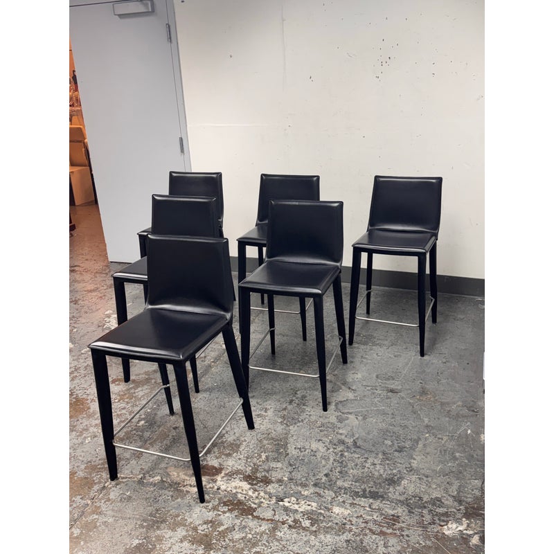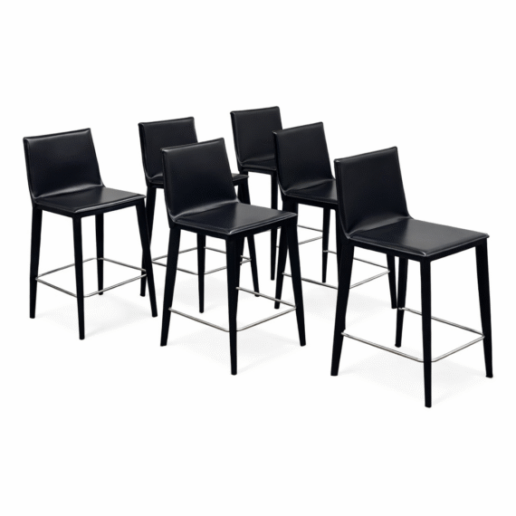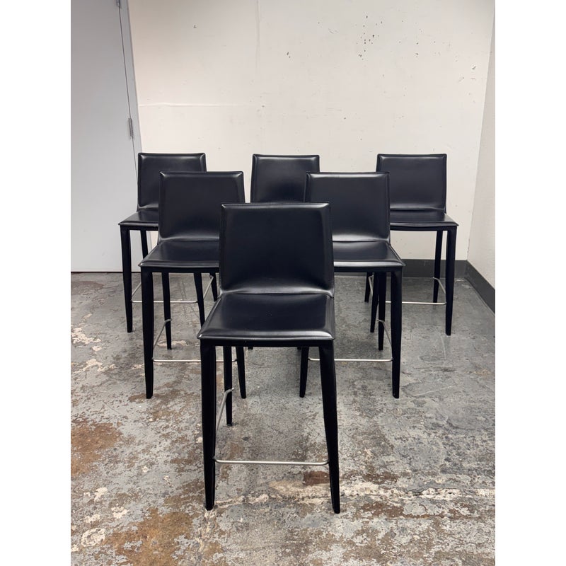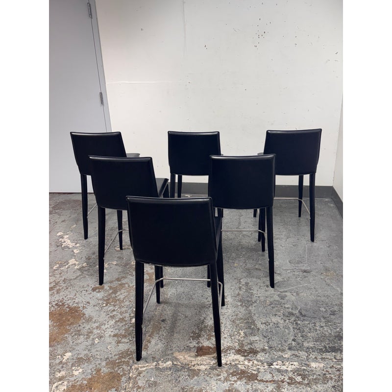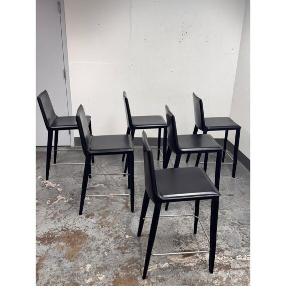 Design Plus Gallery presents a Set of Six of Bottega Counter Stools by Frag for Design Within Reach. This thoughtful seating design was first introduced in 2003 and is constructed with a harmonic steel seat back that flexes with you. Each stool is hand sewn in black leather over its slender yet durable steel frame. The seat is lightly padded so it’s comfortable for extended periods of use. They are in good condition with visible and minimal wear from their usage. Made in Italy.