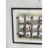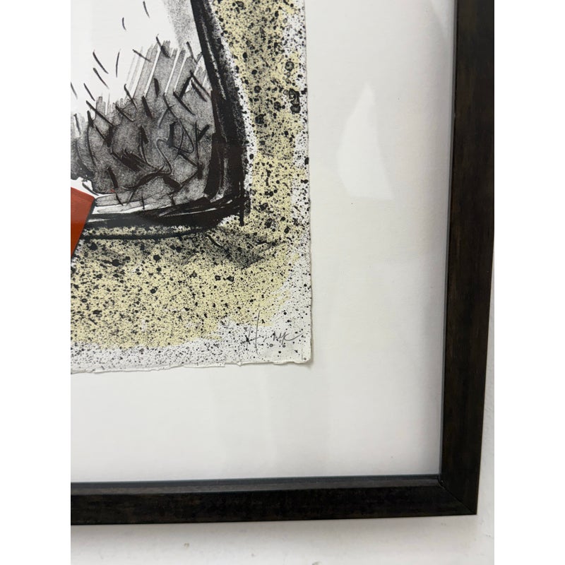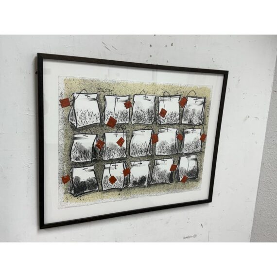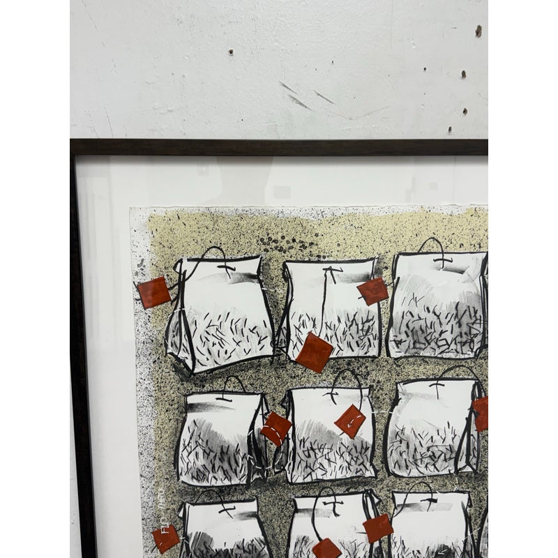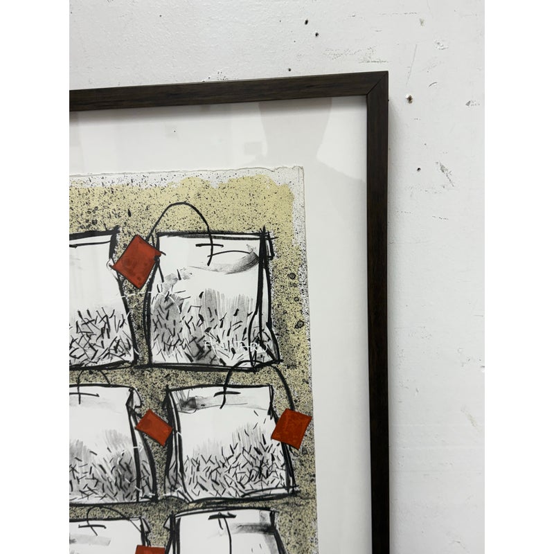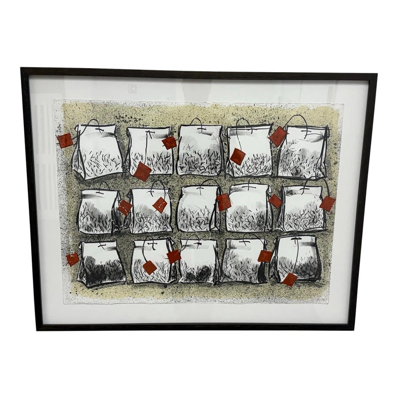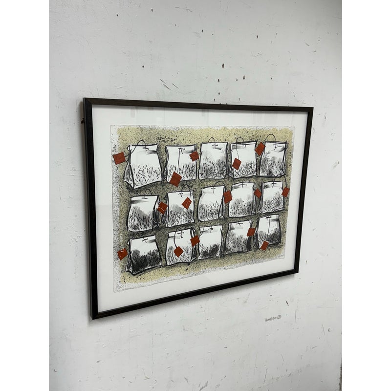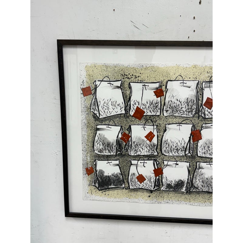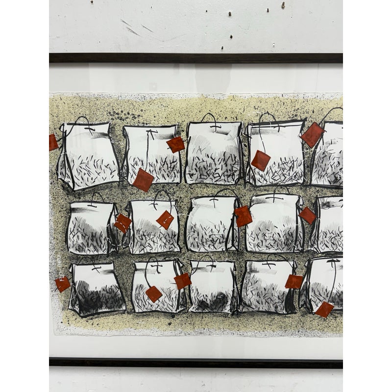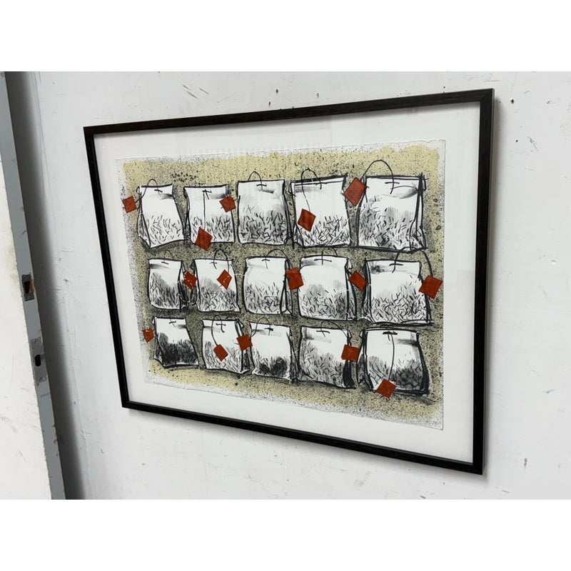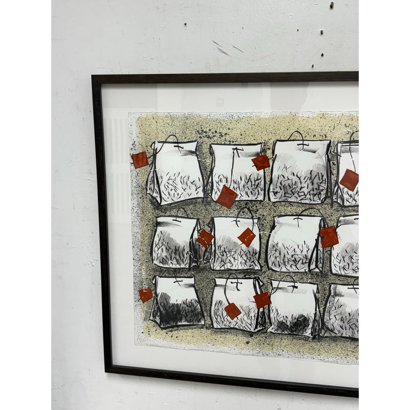 Design Plus Gallery presents a Custom Framed Art Piece that is Signed by the Artist. This artwork boasts an array of Eighteen black + white tea bags, each adorned with a red tag, positioned in three aligned rows of six. The unusual, captivating art piece has been arranged to create a balanced piece where calm symmetry meets reality. A black wood frame add to its stark contrast to the creativity encased within. In good condition, minimal wear.