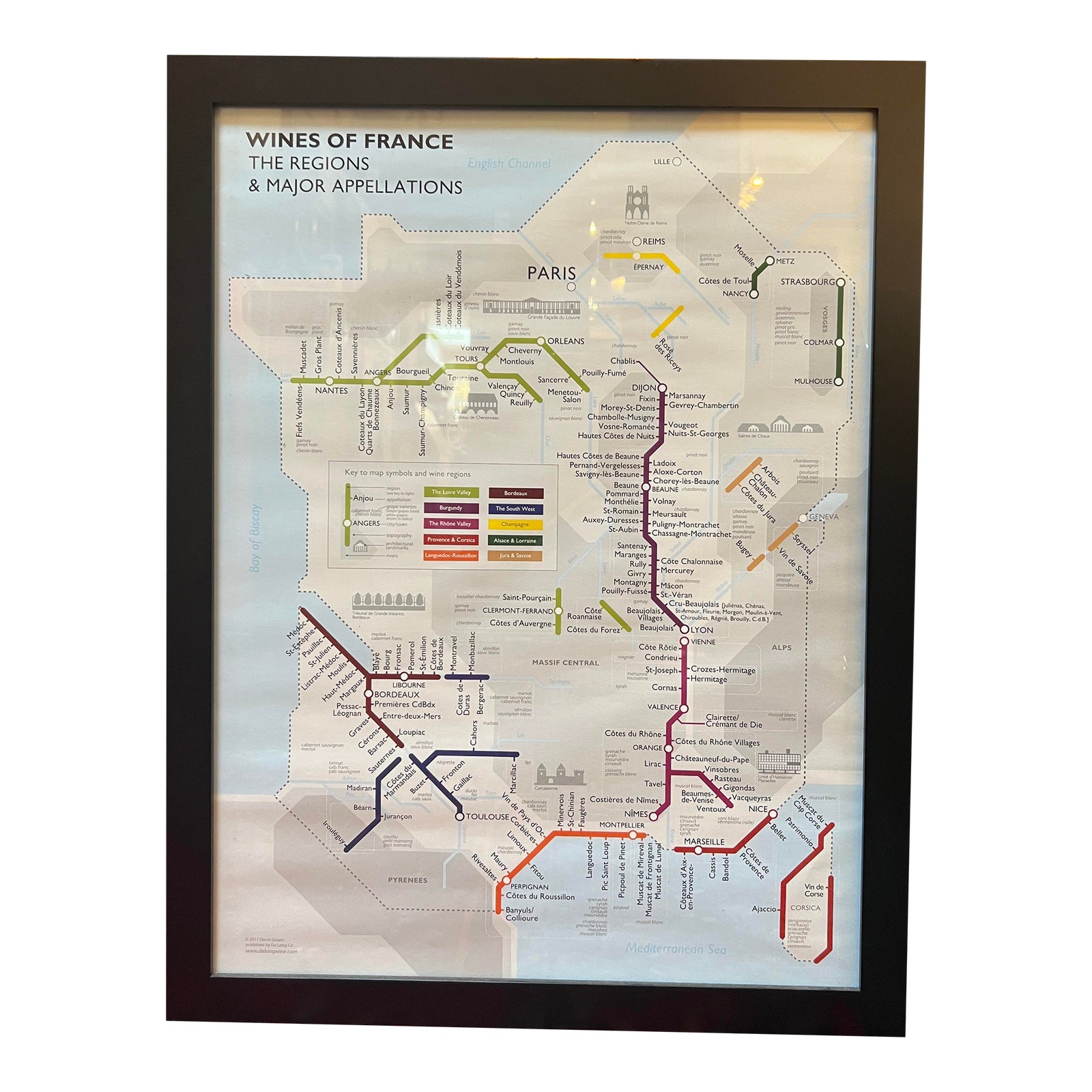Design Plus Gallery presents a Framed Map of France. Mimicing a modern metro map, regions are delineated colorwise for each wine region. Crisp, contemporary black frame in wood. Little evidence of wear; overall good condition.