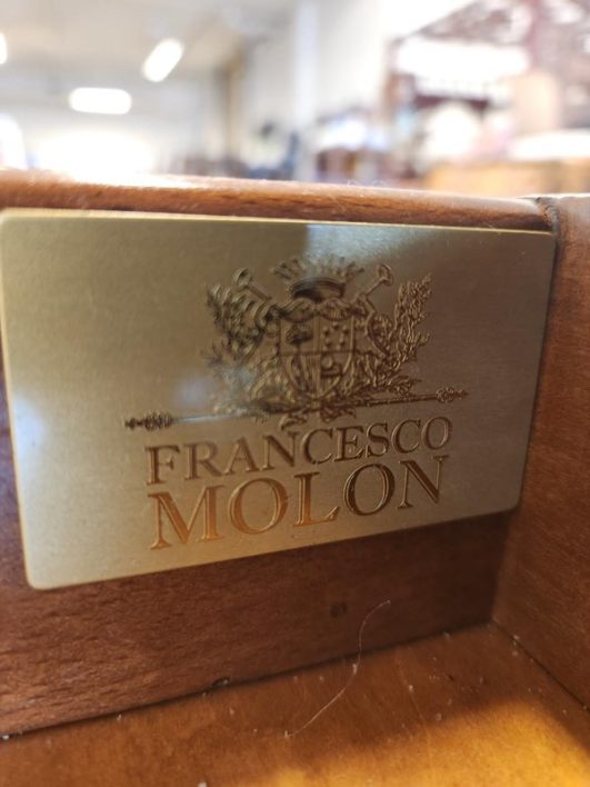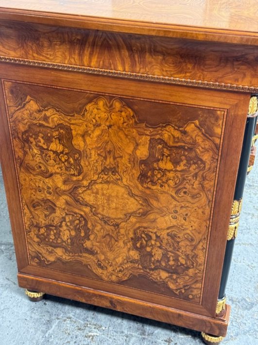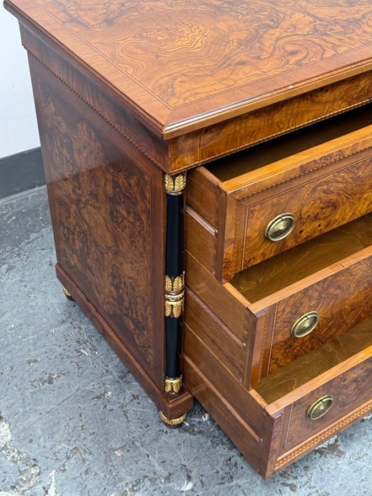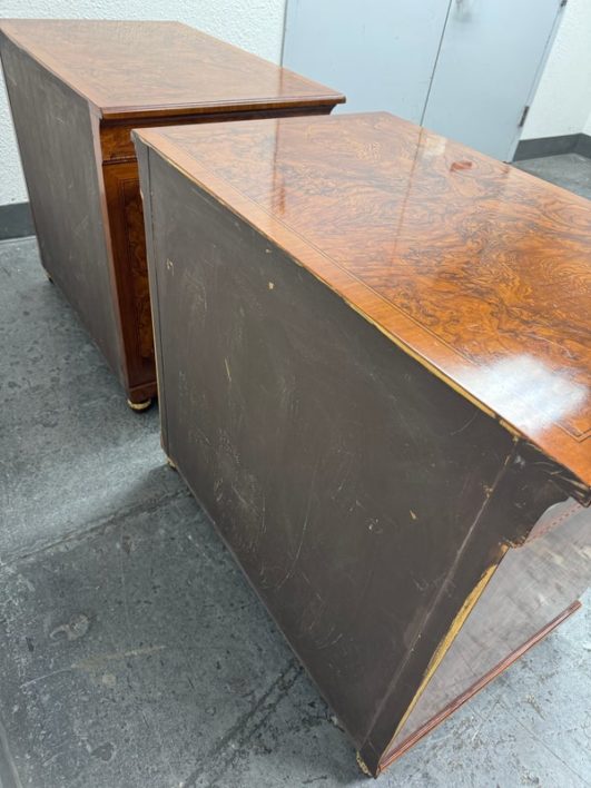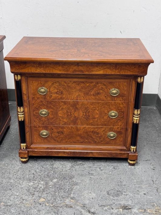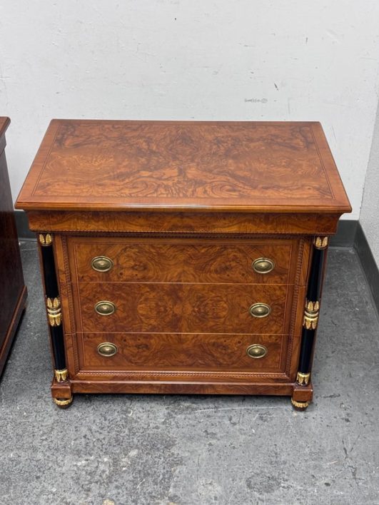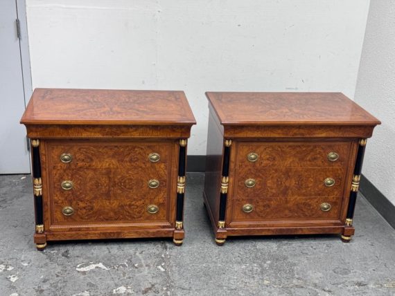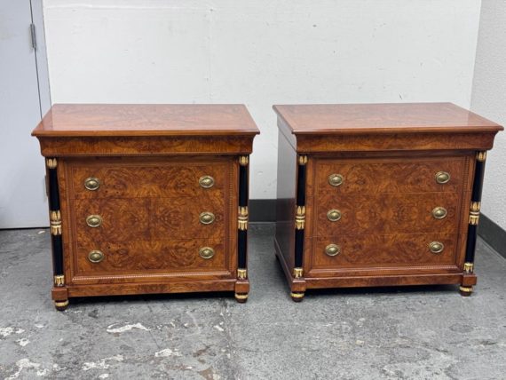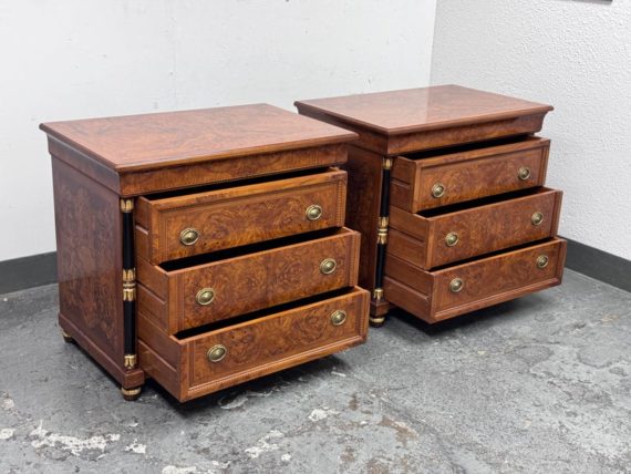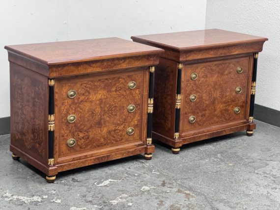Design Plus Gallery presents a Pair of New Empire Classic Three Drawer Novelty by Francesco Molon. The classic new empire tables offer burl wood with solid brass hardware and black lacquered pillar on their sides. The pillars are on either side of the three drawers that take over each solid burl wood piece. High clear shine lacquer makes this piece stand out and last in wonderful condition for ages. Little visible wear and is considered in good condition. Made in Italy.