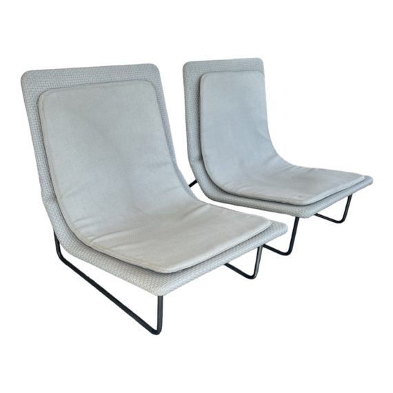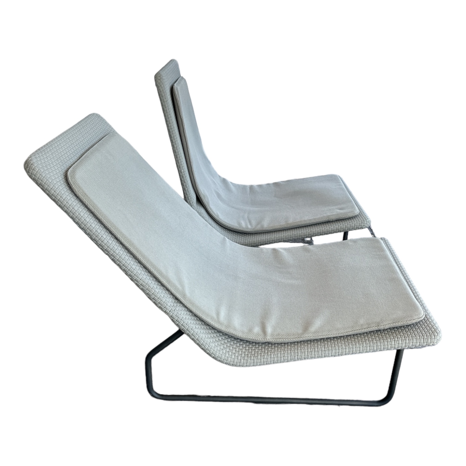 Design Plus Gallery presents a Pair of Sand Chairs by Paola Lenti, Italy. Designed by Francesco Rota, 2003, this elegant pair of sun loungers is crafted with structure is made of cataphoresis treated steel with polyester varnish. Each is upholstered with Paola Lenti’s signature Rope waterproof fabric in light gray. The visible metal segments are made of brushed stainless steel. The seat back is adjustable, the cushioned seat pad is removable. Visible soil; condition is fair for age and use.