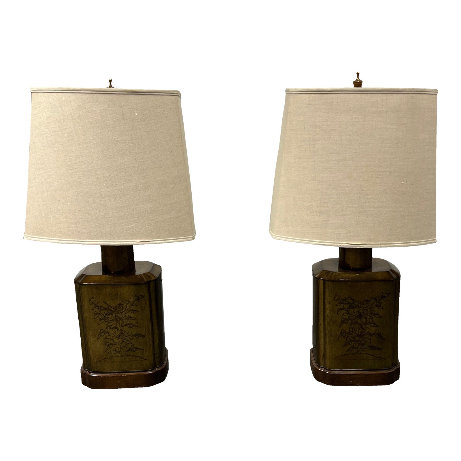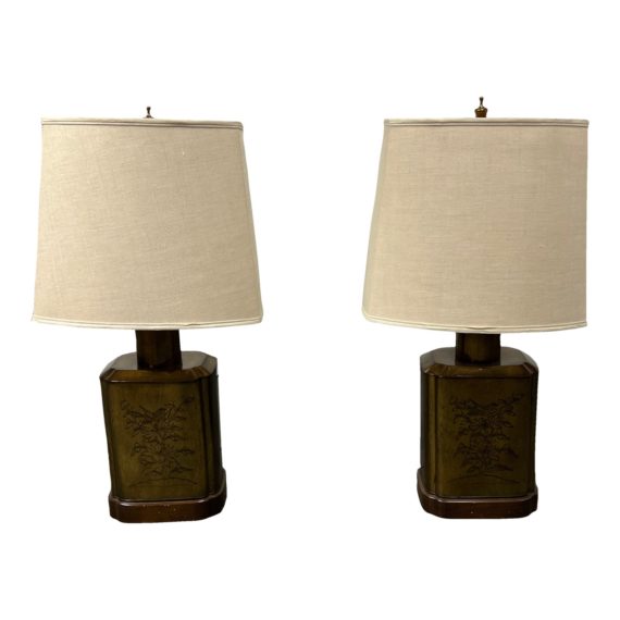 Design Plus Gallery presents a Pair of Vintage Frederick Cooper Style Chinoiserie Etched Brass Tea Cannister Table Lamps. A tall square tea canister ginger jar with four panels with floral + bird motif etched designs on two sides. The beveled bases are wood frames in a dark finish. Accompanied with tapered square shades. Visible + minor wear from usage + age, may need new re-wiring.