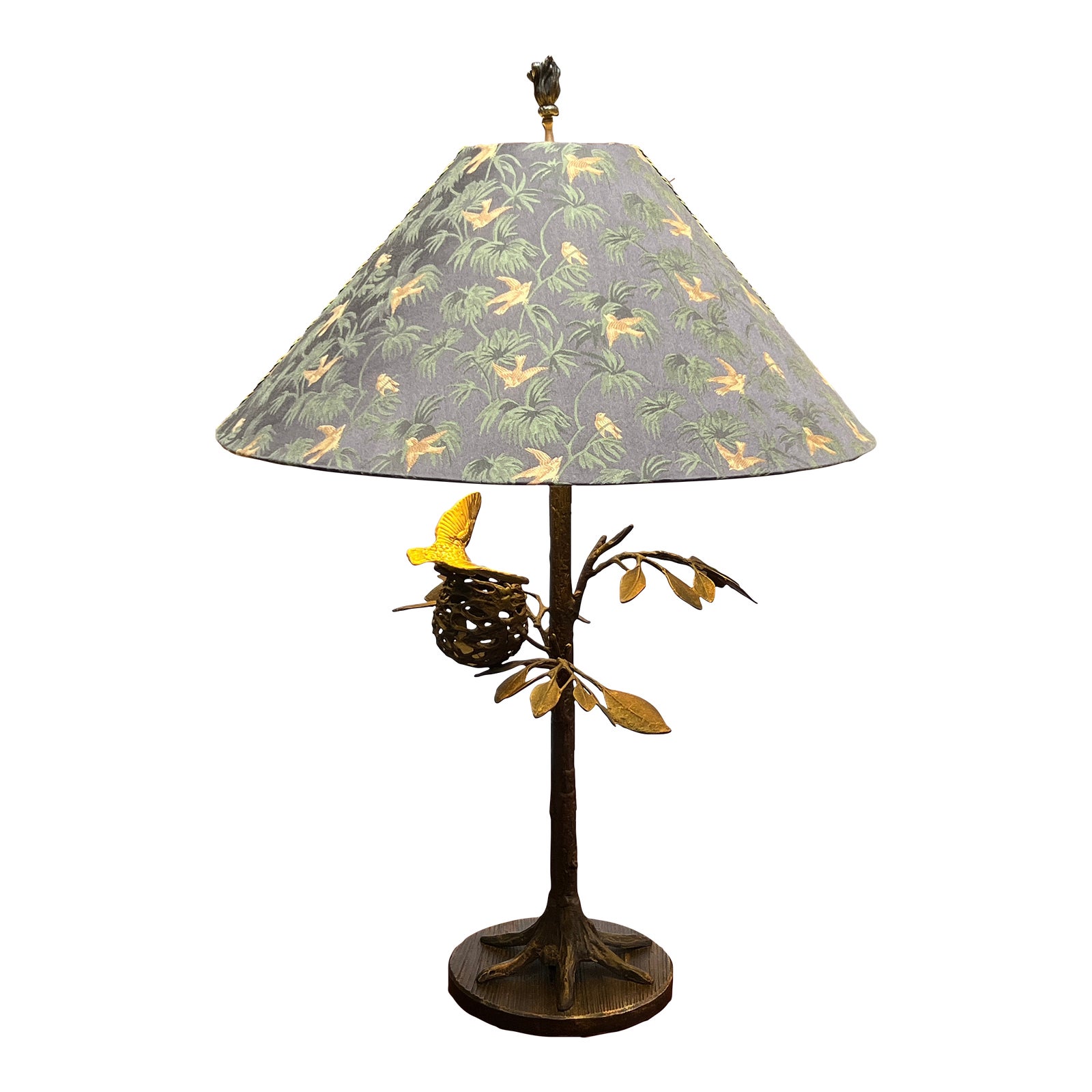 Design Plus Gallery presents Fredrick Cooper’s Vintage Bird’s Nest Table Lamp. Cooper’s artistry began in Chicago in 1923 where he began mixing media of brass, fabric, glass and wood. Within that media he was able to create exquisitely designed lamps that matched the swift innovations in architecture and have proved to last the test of time. Today, Fredrick Cooper stands for superlative design and craftsmanship. This lamp has a gilded bird in flight and an intricate bird’s nest nestled into the branches of a tree. The tree is unique with rough rustic bark, large expansive roots, graceful branches and leaves and a delicate birds nest. There is a custom made shade of birds flying foliage to accentuate the design. In good vintage condition with wear that is consistent with age + use.