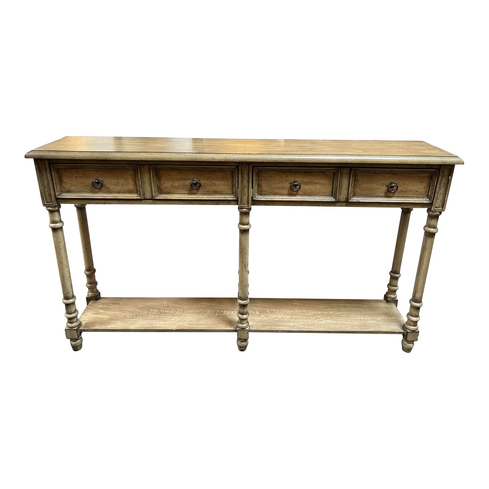 Design Plus Gallery presents a French Country Console. Slim in scale and full on style, the lovely oak veneer console features beveled edges and tune legs. Plenty of display space on top and on the full lower shelf. Bronze finished fittings on pair of shallow drawers. Side bevels have been DIY modified as shown, otherwise good overall condition.