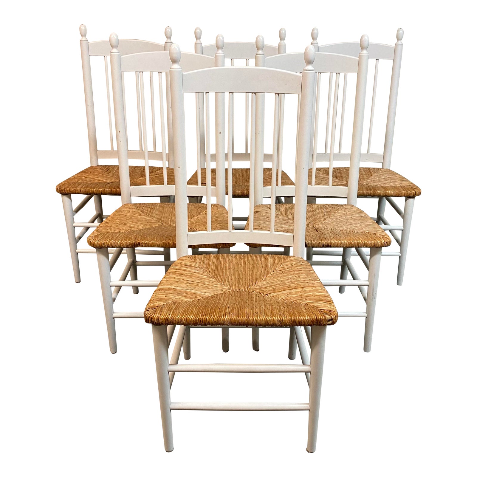 Design Plus Gallery presents Set of Six Summer House French Country Rush Seat Dining Chairs. Some of the chairs show wear on the rush material and along the wood frames. White high back frame contrasts the warm tone of the seat. European country chic meets modern transitional living.