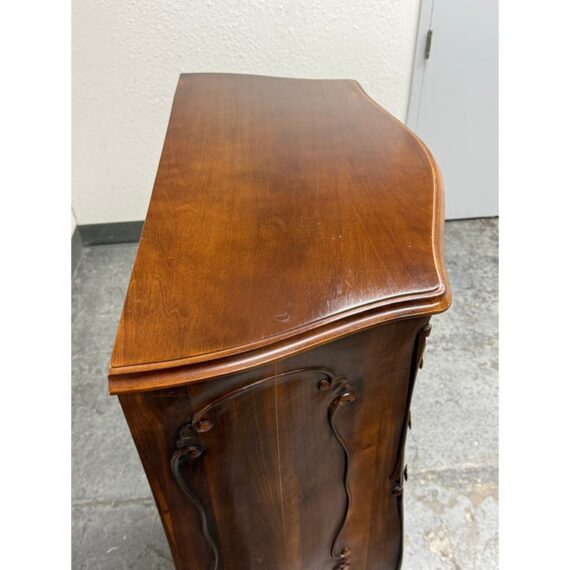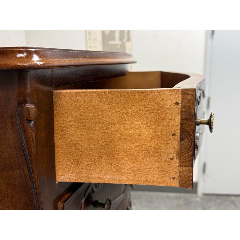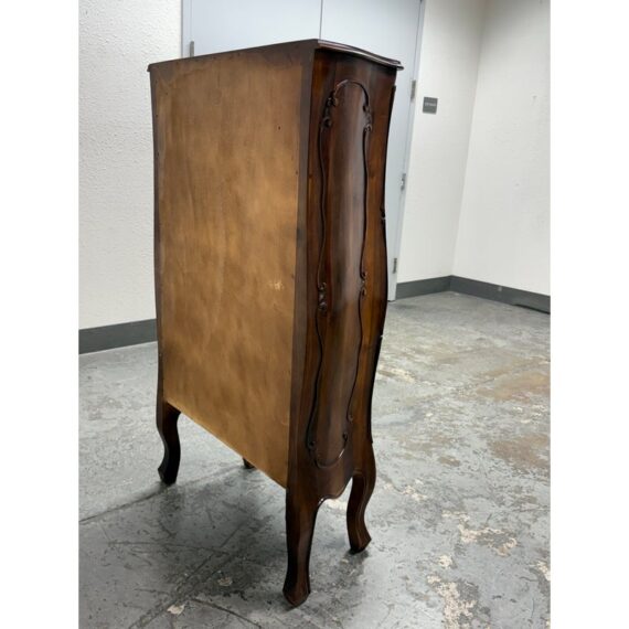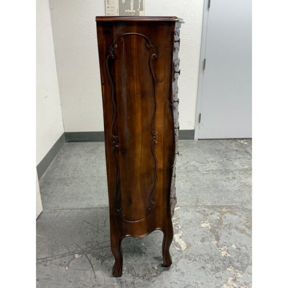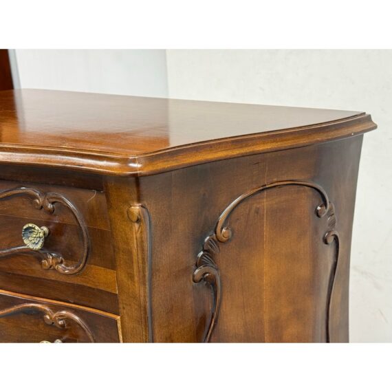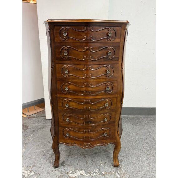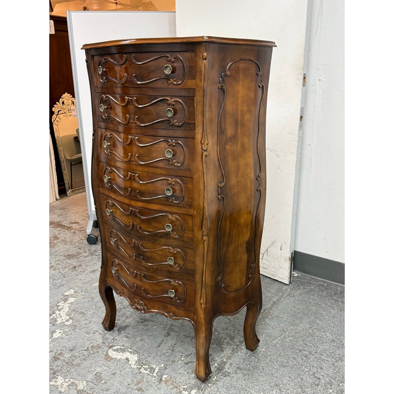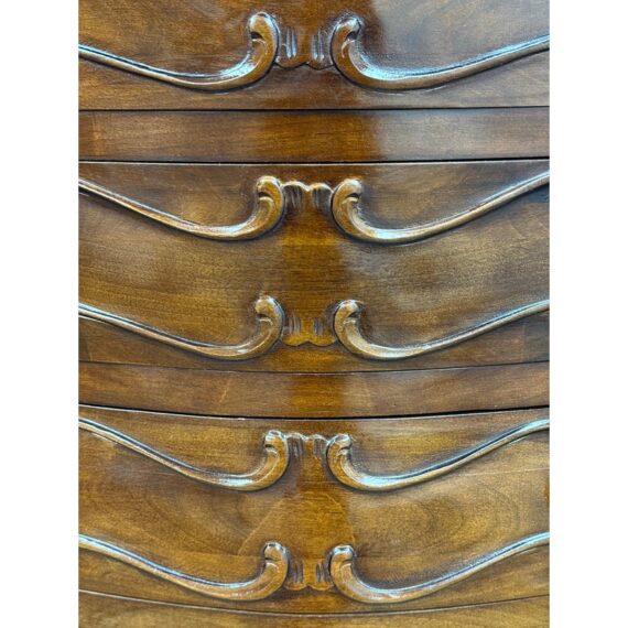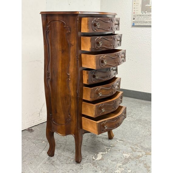 Design Plus Gallery presents a Chest of Drawers in the Louis XV Style. The chest of seven drawers is perfect to tuck into a small niche in your home for storing valuables or soft linens. It has serpentine shapes to the sides with a bow front facades enhanced by the carved symmetrical molding. The boldly scrolled apron below is flanked by scrolled legs carved with upturned acanthus plumes and tipped with escargot feet. The sheer beauty of the wood is an everlasting charm. It is in good condition with visible wear that is consistent with its usage.