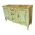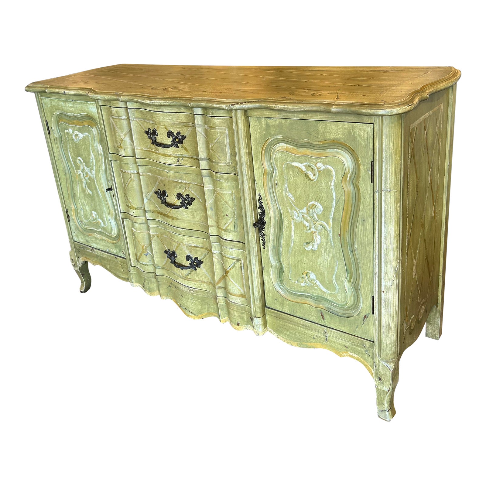 Design Plus Gallery presents a French Provincial Green Sideboard. Constructed with fruitwood in a distressed green finish. Features include two cabinets with fixed shelves and three drawers. The top, sides, and drawers have a textured diamond pattern with subtle wave accents. Metal hardware is present. The drawers have handles and the cabinets have ring pulls. Minor wear consistent with use; sideboard is in good condition.