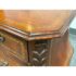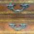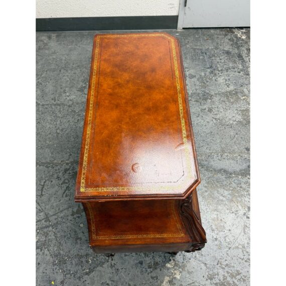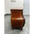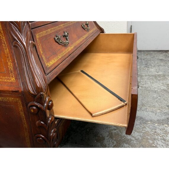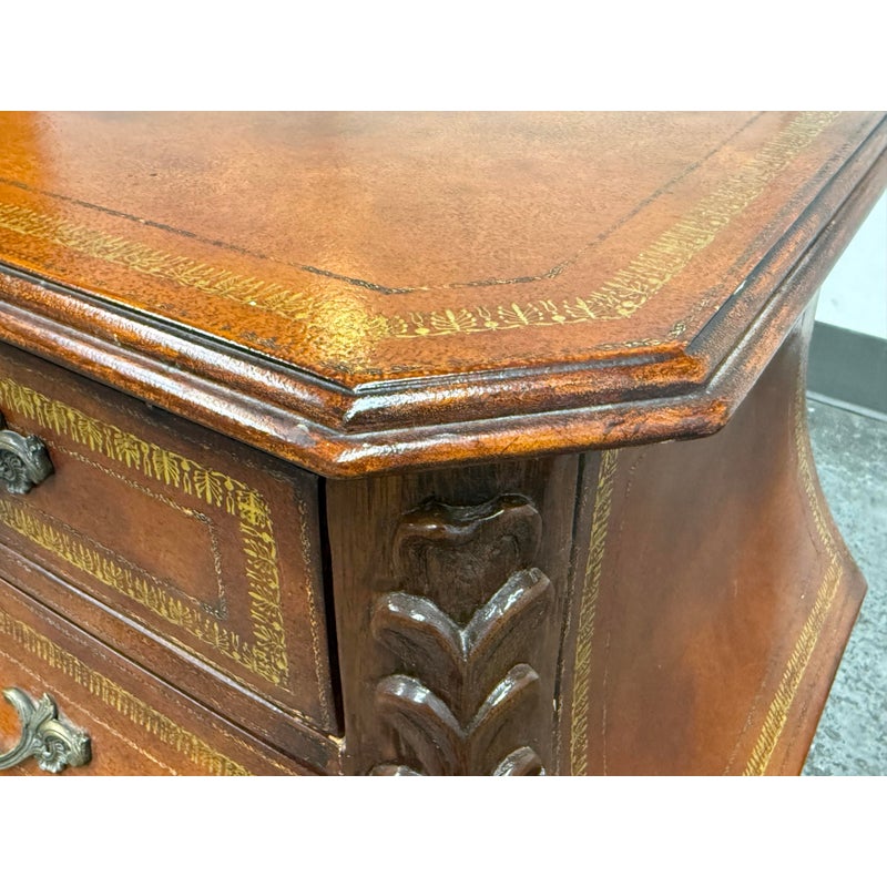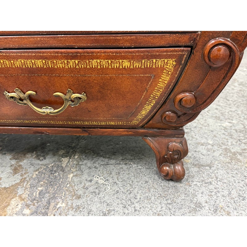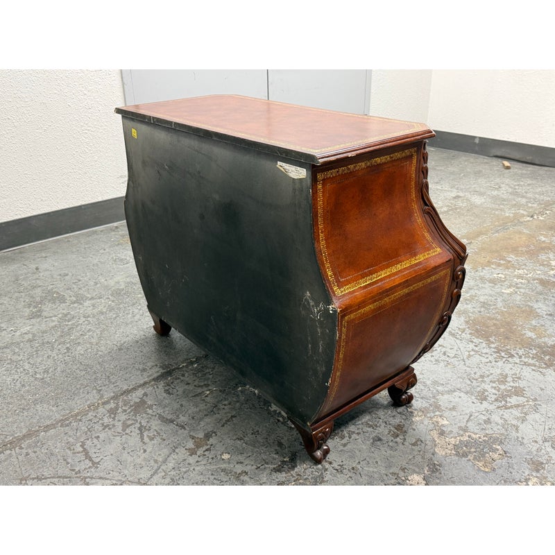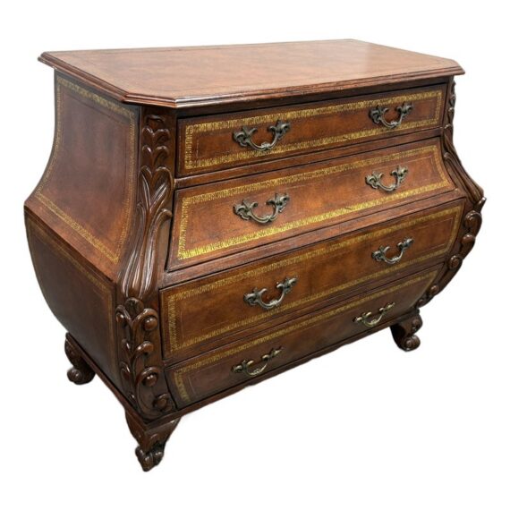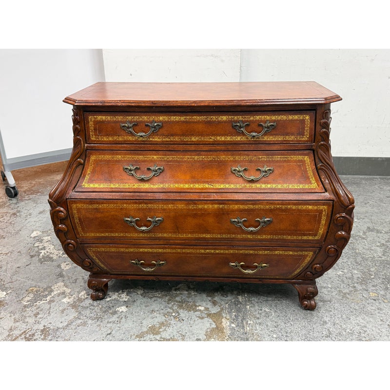 Design Plus Gallery presents a Vintage Bombé Chest of Drawers + Gilt Accents. This four drawer case has a serpentine profile with shaped sides, carved scroll accents, and ornate metal bail pulls. The drawer fronts and side panels are outlined with gilt decoration that adds contrast to the wood grain, while the bracketed top and carved feet reinforce its traditional European inspired styling. It is in good condition with visible and minimal wear from usage.