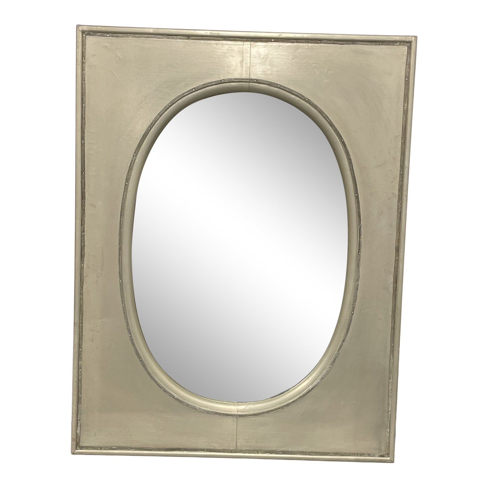 Design Plus gallery presents a French Silver Metal + Wood Oval Mirror. Wood frame is painted with a rich silver paint and accented with hammered metal perimeter around the oval frame and rectangular outer frame. Minor wear through out adds to the vintage charm. Mirror is in good condition. Hardware for hanging vertically and horizontally is located on the back. Custom made in 2008.