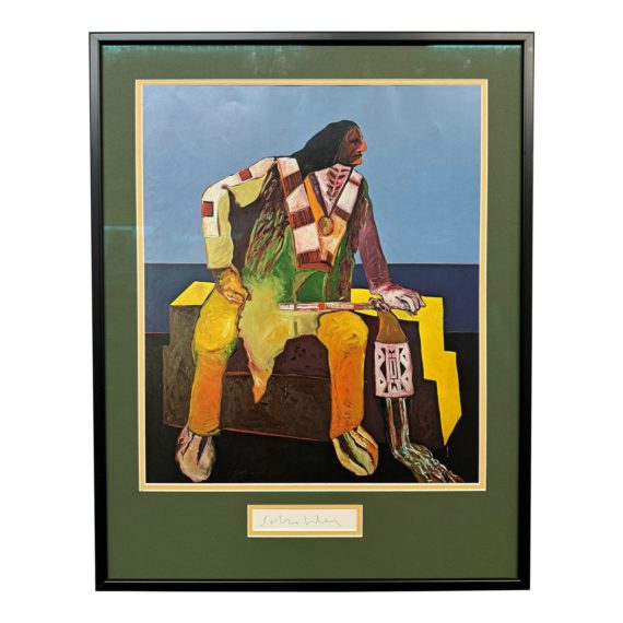 Design Plus Gallery presents “Deco Indian” Poster Signed by Fritz Scholder. The decorated Indian, as seen was created and used as the ephemeral for the very first Western States Biennial Exhibition, where 28 western artists gathered to showcase their artwork in the late 80s. The Indian shown is in repose with traditional dancer garb on to showcase their talent for artistry, meaning their clothes and possibly pondering the dance tribes are known for. Signature is at the bottom of the poster and professional matted/framed, in good condition.