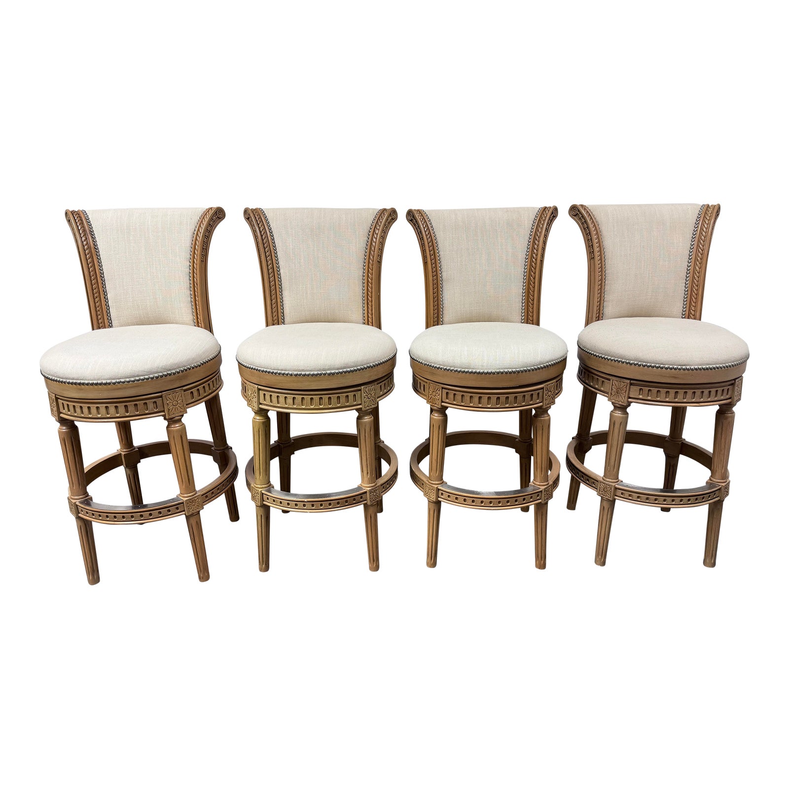 Design Plus Gallery presents a Set of Four Swivel Barstools by Frontgate. The solid hardwood frame features a rolled back with upholstery on both sides that is finished with nailhead trim. Stately carved detailing along the fluted legs and apron add a touch of refinement. Kiln-dried solid hardwood frame constructed with mortise and tenon joinery for lasting durability. 180° return-swivel mechanism. High-density foam cushion surrounded with fiber fill and a polyester wrap for maximum comfort. Brass-plated footrest. Once stool swivel mechanism does not swivel completely. Visible and minor wear from usage + age. Made in China